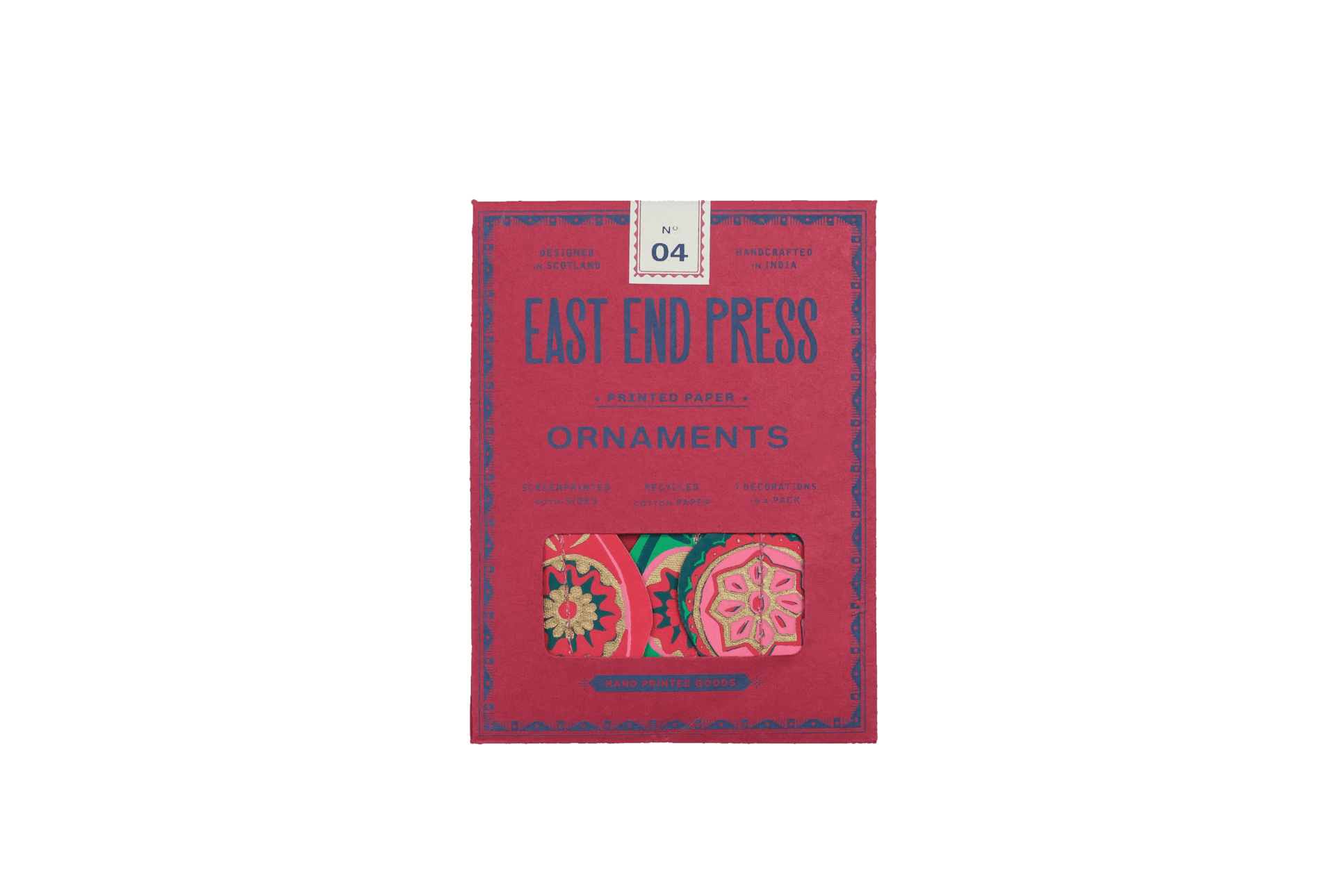 Minimum order: 6 - A set of 4 illustrated paper decorations with cotton 10cm hanging loop - Screen printed by hand on both sides by talented artisans in Jaipur - Sustainably made from recycled materials