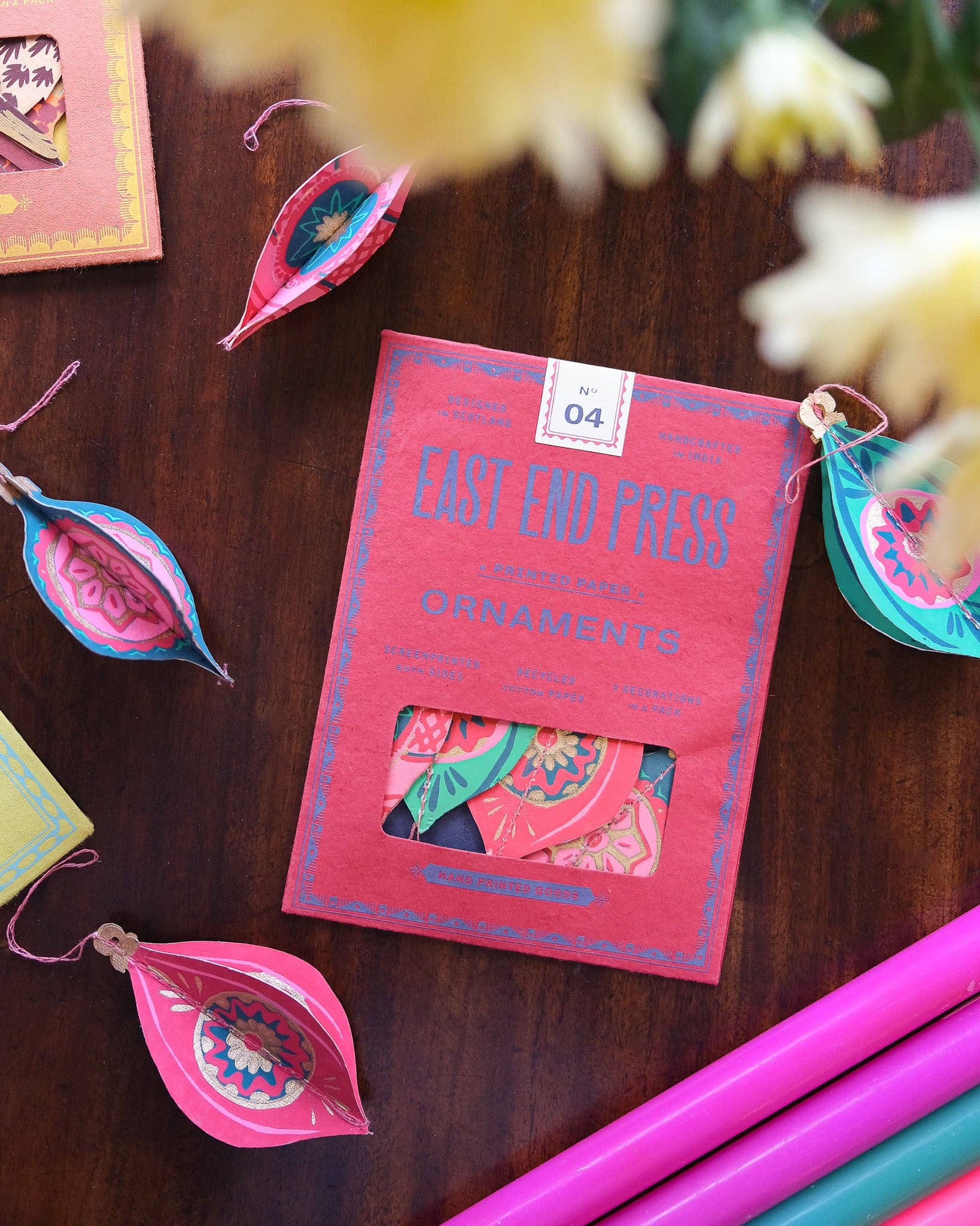 Each ornament features a different design, and each ornament is designed to fold out and create a three-dimensional paper shape with a cotton hanging loop.