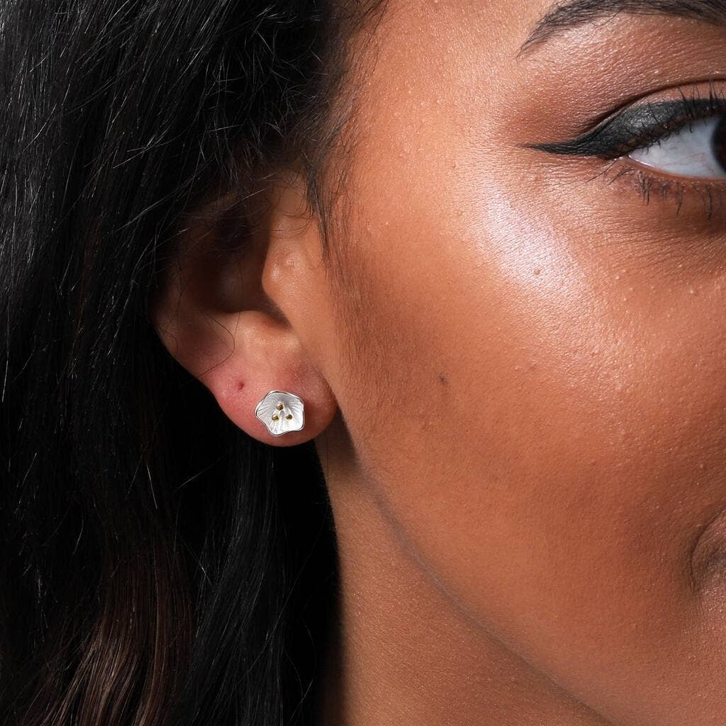 Gorgeous little flower earrings presented on a card that reads "no rain no flowers" Gift Ideas: A lovely present for mothers, daughters, friends, partners, collagues, teachers, bridesmaids, girlfriends, wife or granddaughters. Great to give for a birthday, Christmas, graduation or thank you gift Item Description: Pair of stud earrings with butterfly backings Sterling silver with 18k gold plated sterling silver detail Approximately 0.9cm