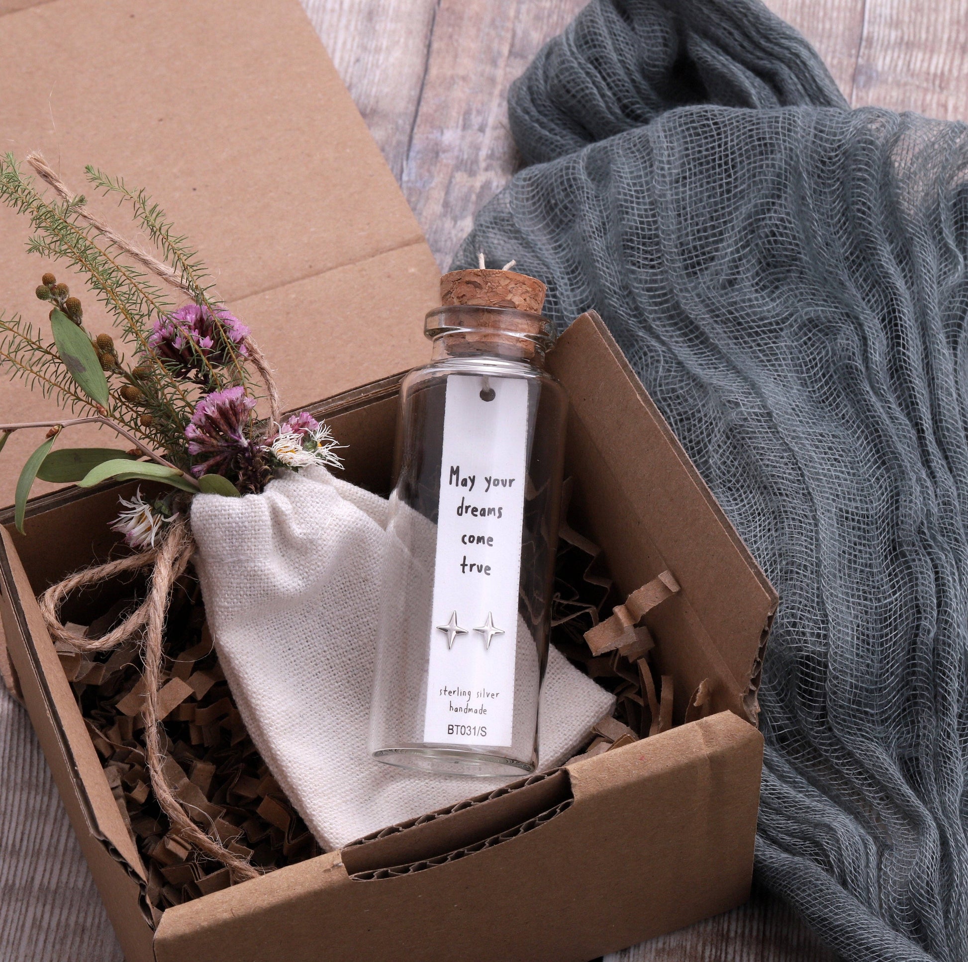 Sweet twinkle shaped earrings presented on a lovely card that reads "may your dreams come true" Gift Ideas: A lovely gift to give a sister, daughter, friend, partner, niece, grandaughter or mum. A fantastic gift to give for a birthday, new home, graduation, new job or thank you gift. Item Description: Pair of stud earrings with butterfly backings Sterling silver or 18k gold plated sterling silver detail Approximately 0.6cm
