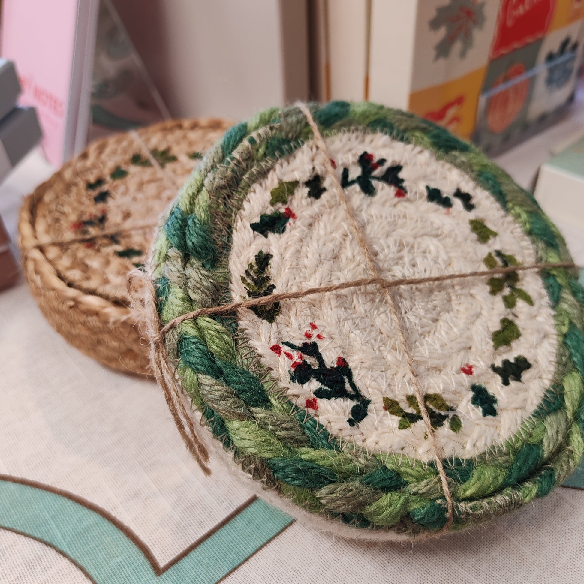 Christmas jute coasters -set of 6 in basket. 12cm