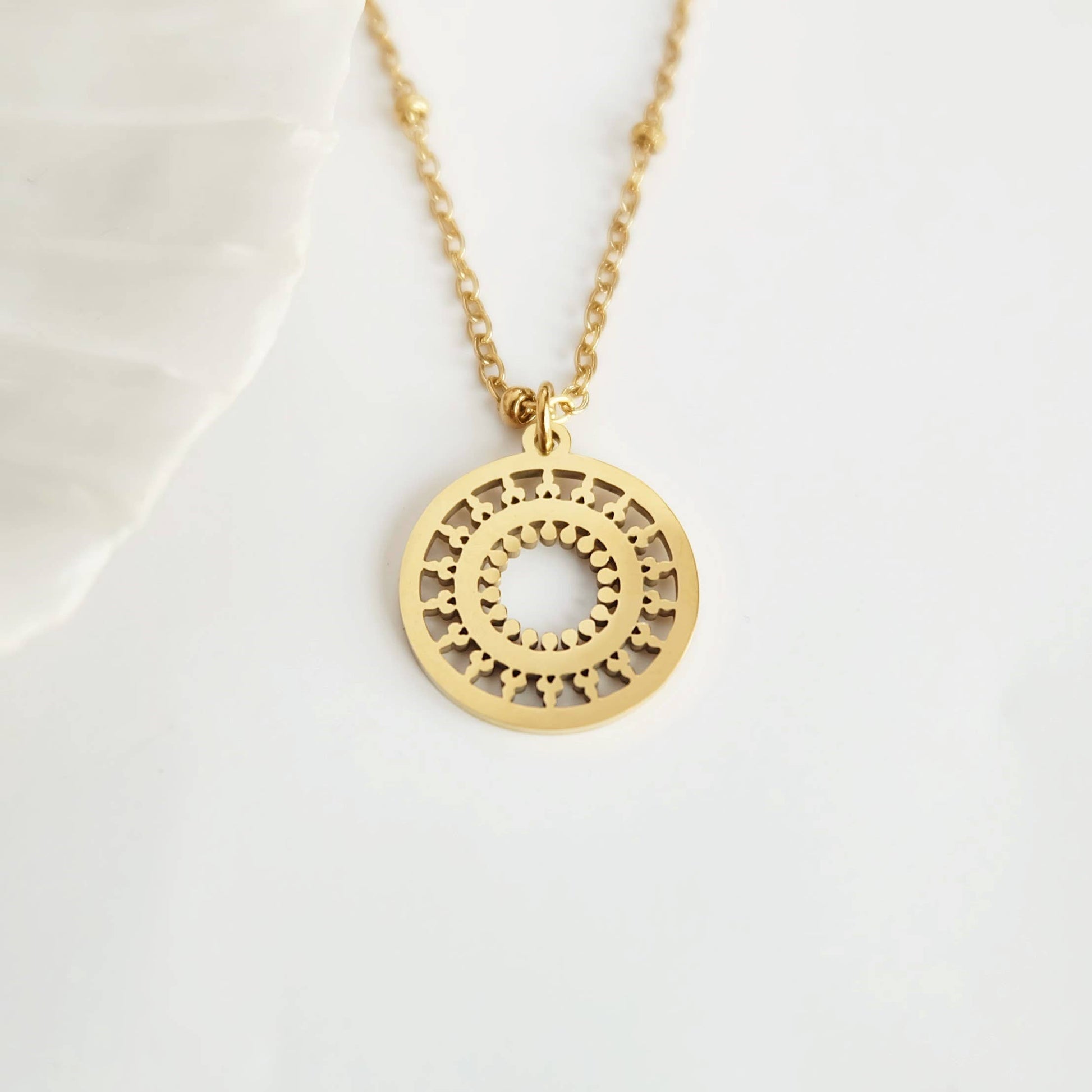 A delicate cut-out mandala charm adds just the right touch of intrigue to your necklace layers or stands beautifully on its own as a subtle statement. Lightweight and comfortable enough for all-day wear, this piece carries deeper meaning—the mandala represents the universe in perfect harmony and the journey toward inner balance and self-discovery.