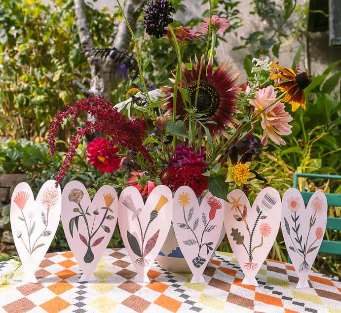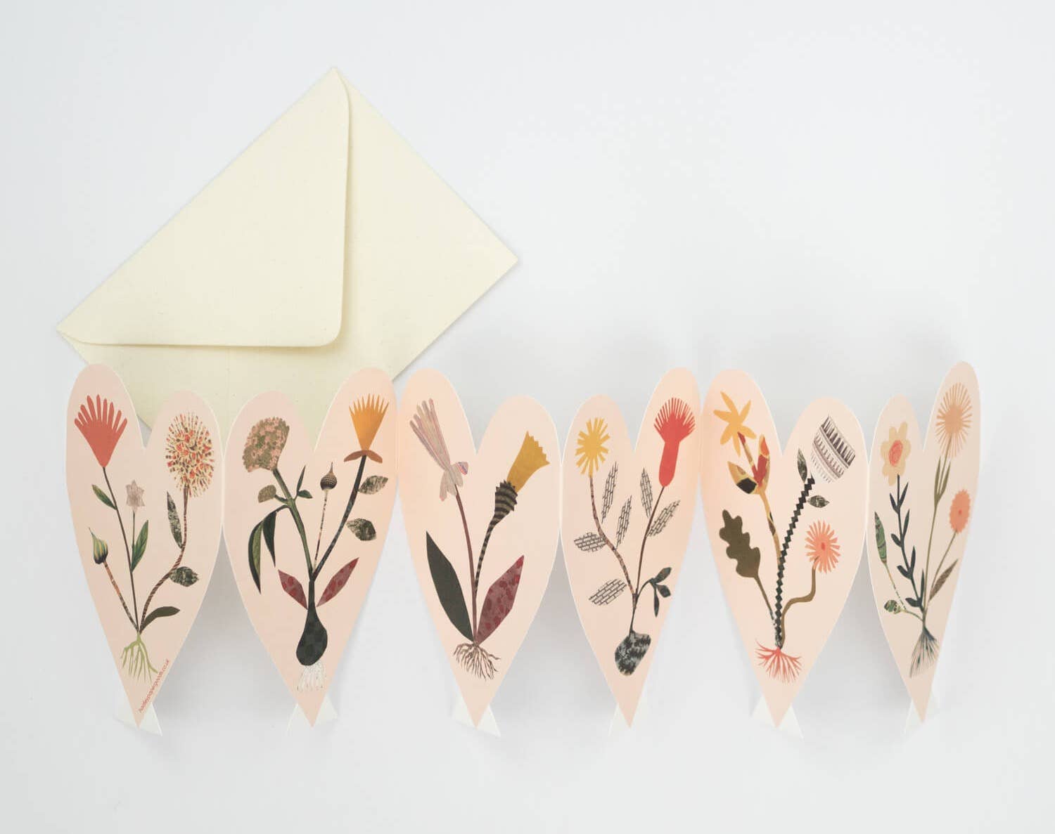 A concertina of beautiful hearts! Featuring hand-collaged whimsical wild flowers in a beautiful natural colour scheme.
