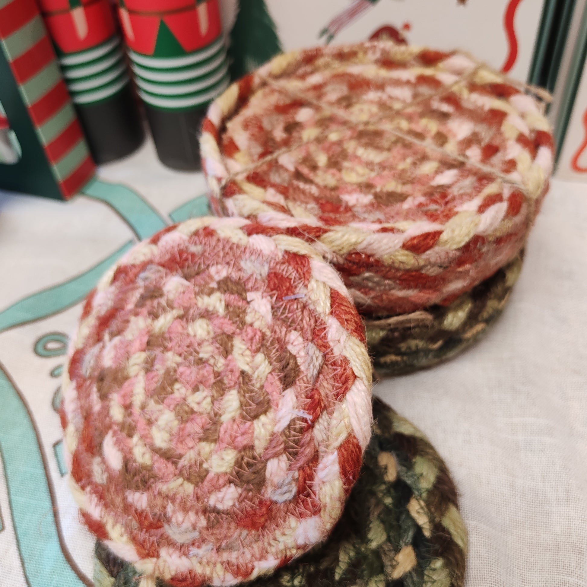 This set of 6 jute coasters in a lovely coral color comes in a convenient storage basket. Made from a natural and eco-friendly material, these coasters provide a sustainable and stylish way to protect your furniture. Keep them organized and easily accessible with the included storage basket.
