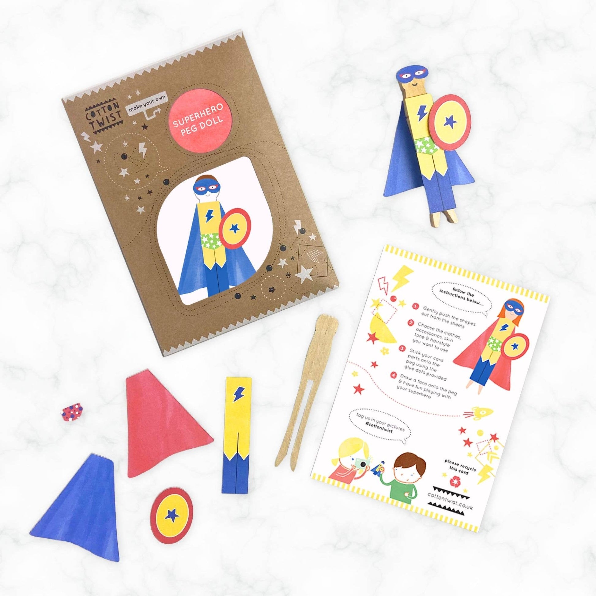 Children love to craft & create, & this superhero peg doll is no exception. Not only a fun activity, this peg doll also sparks imaginative play. The superhero comes with jumpsuit, cape, shield, mask & a choice of pants, together with a choice of skin tones & hairstyles for further personalisation.