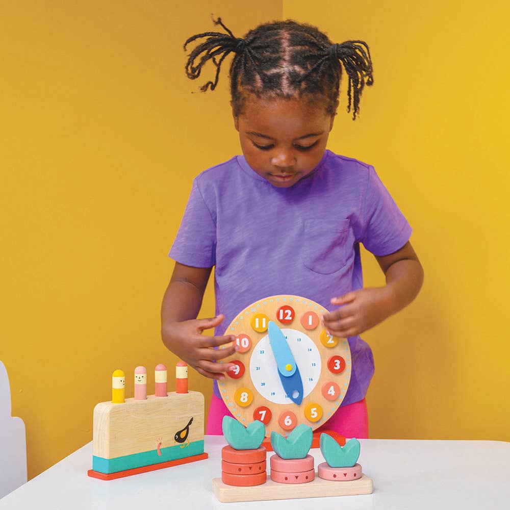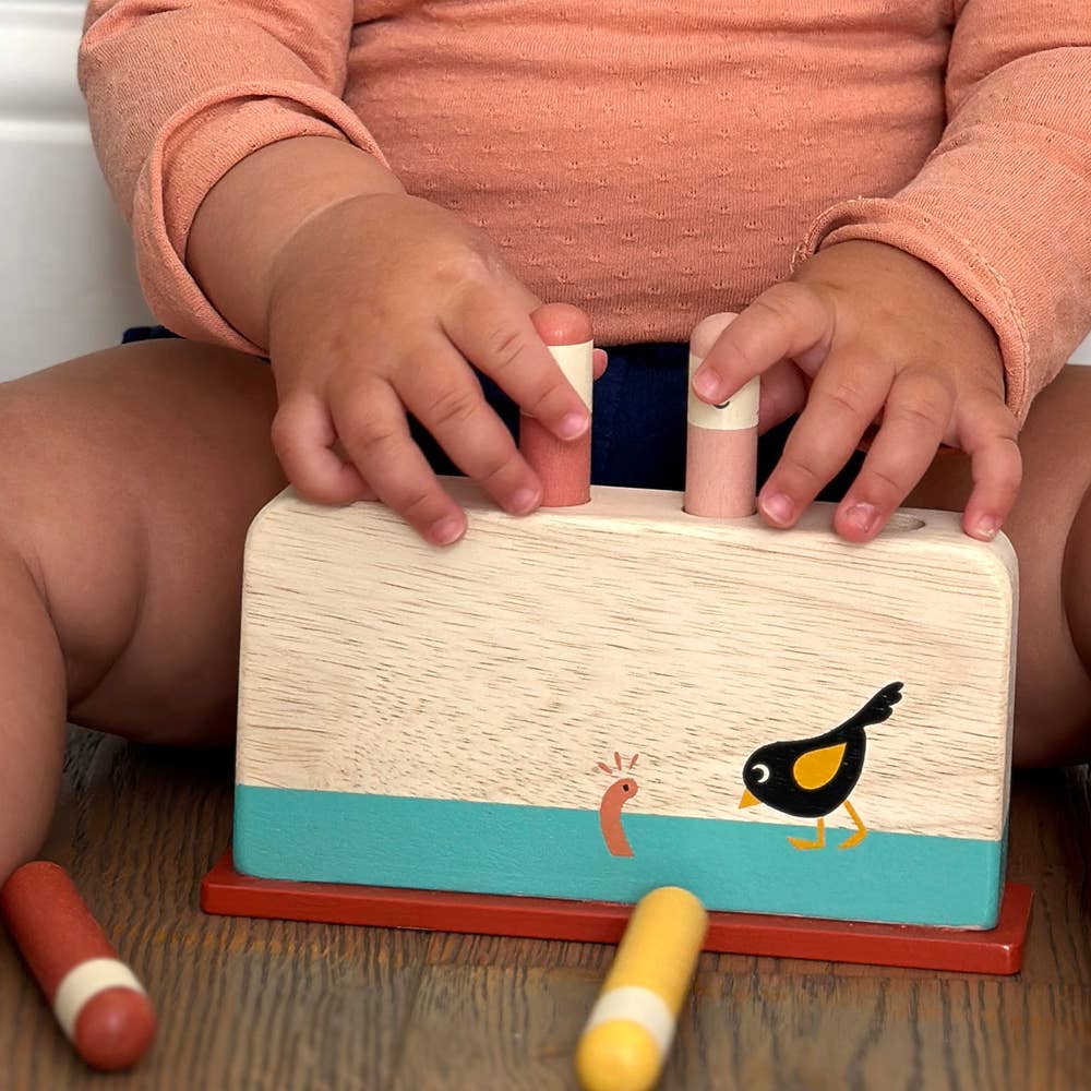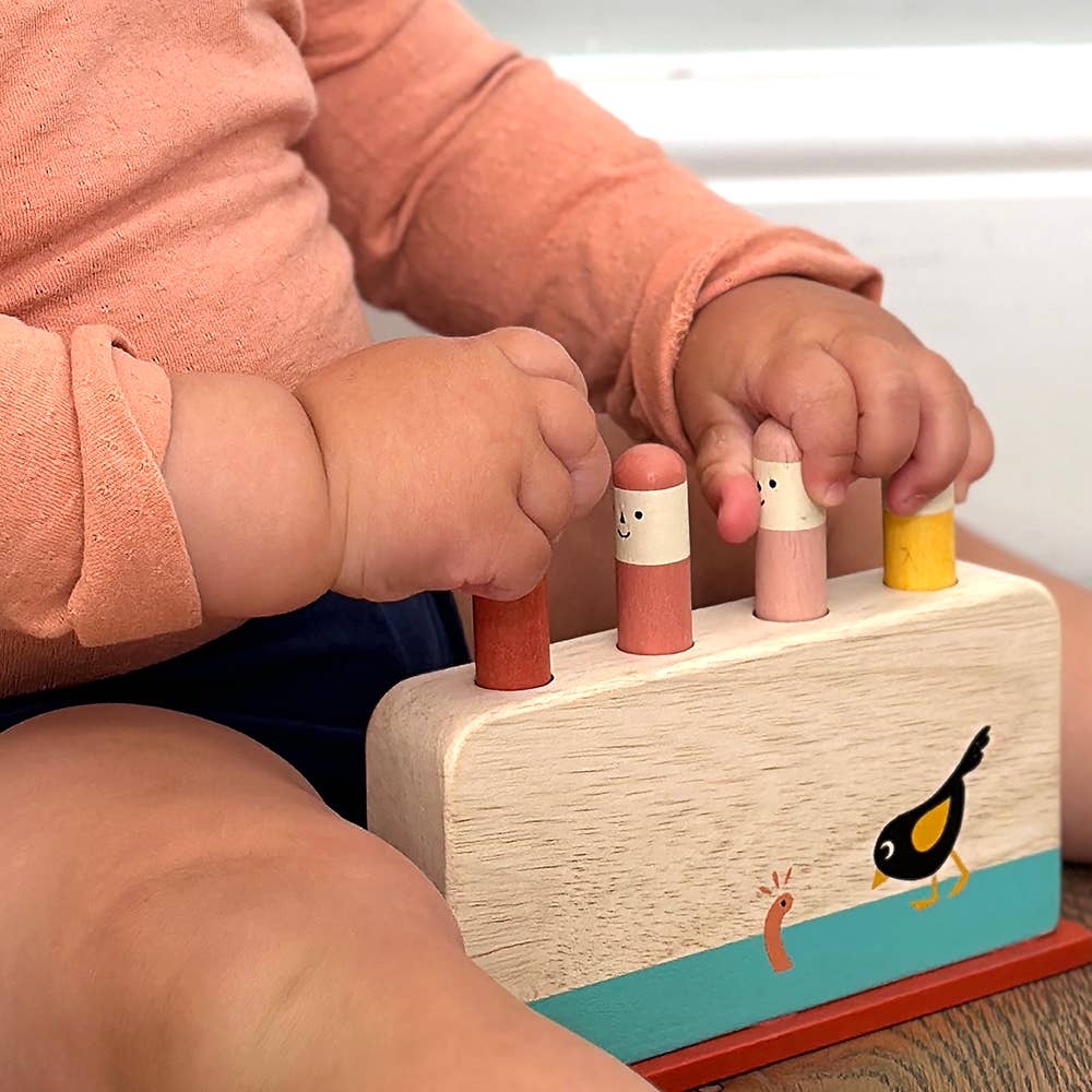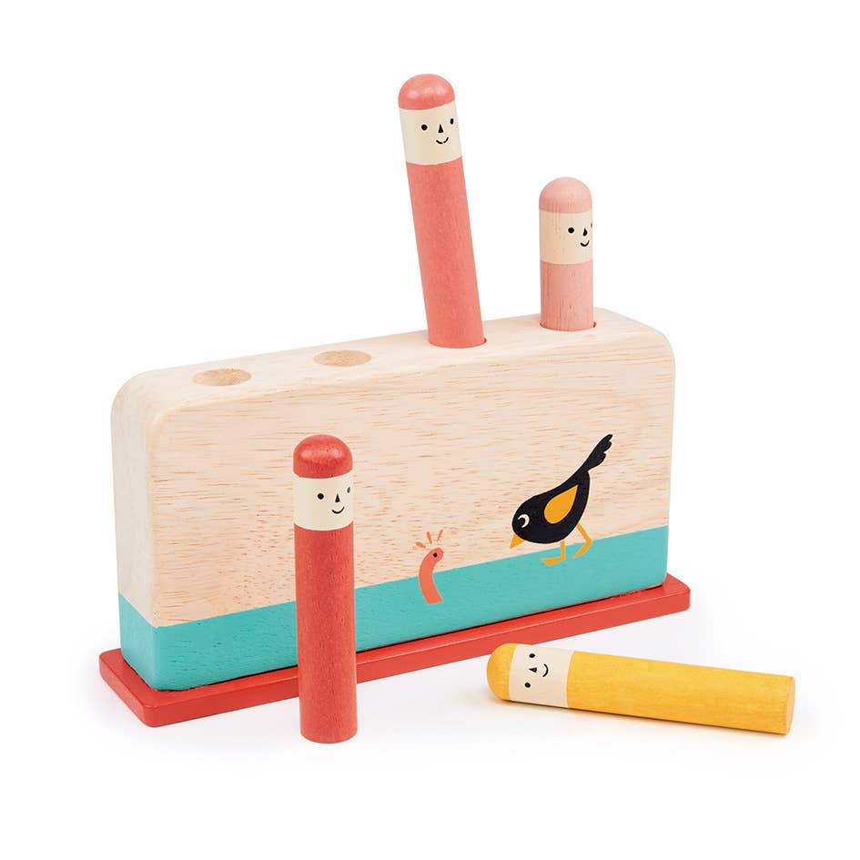 This wooden game by Mentari comes with 4 rounded pegs that resemble garden worms. Illustrated with the early bird. Push the pegs down and watch them fly up. Crafted from sustainably sourced rubber wood - SVLK - Indonesia’s Timber Legality Verification System Product size: 17 x 4 x 12.5cm Pack size: 13.5 x 4.7 x 17.9cm Suitable for ages 18 months +. This product is designed in the UK with values relating to LIVING, feeling good about design values and home, LEARNING, feeling good about growth and development and LEGACY, feeling good about longevity and responsibility.