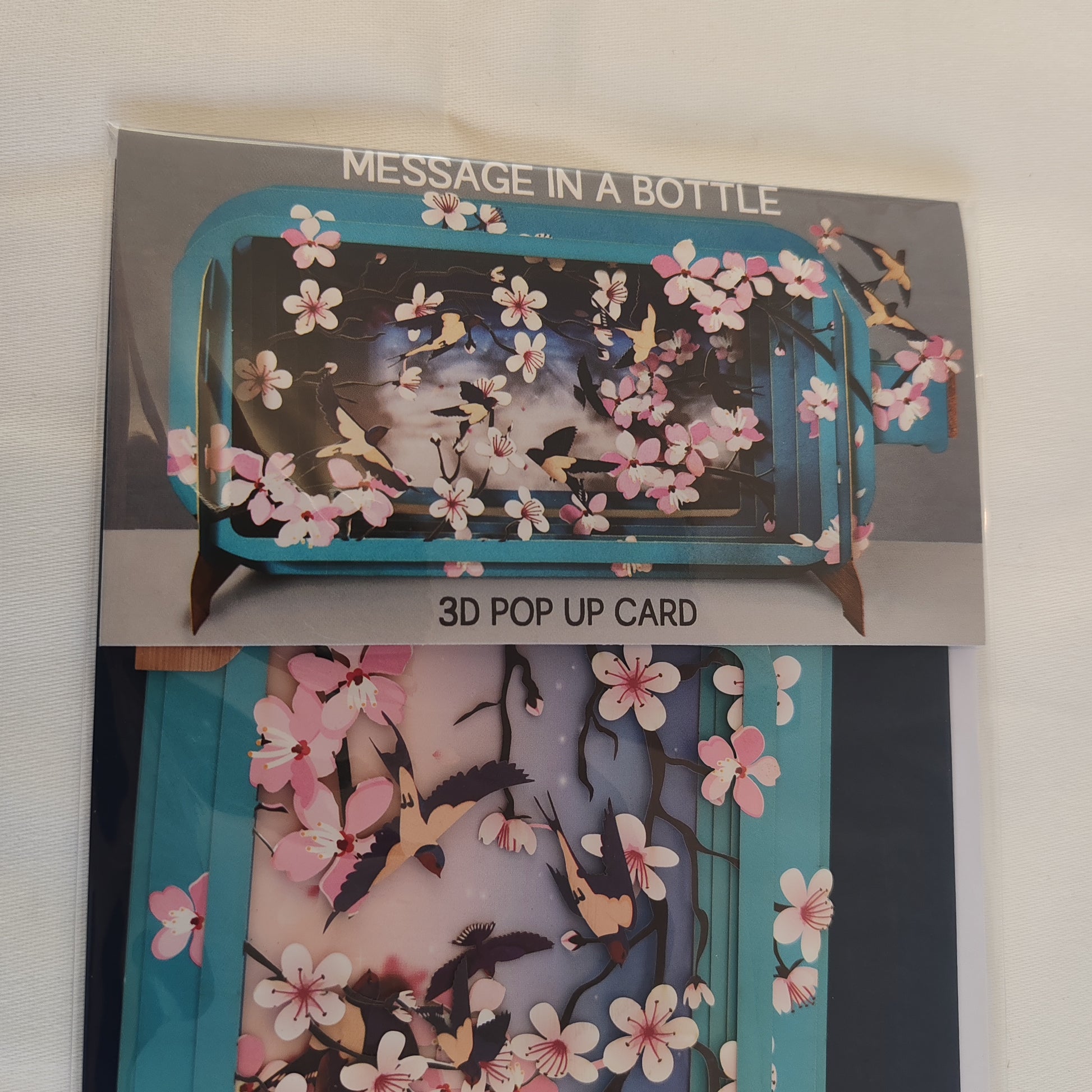 Message in a bottle 3d pop up greeting card. Cherry blossom theme.