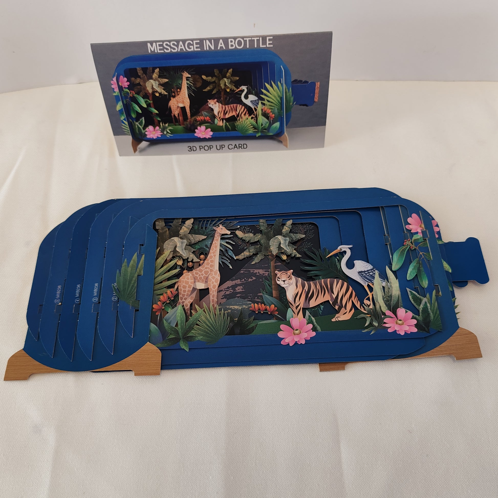 "Get wild with this unique Message in a Bottle Exotic Animals Greeting Card! Watch as the safari-themed pop-up design brings the message to life. Give a card that's truly one-of-a-kind and stands out from the pack. Perfect for animal lovers and anyone looking for a fun and playful card."