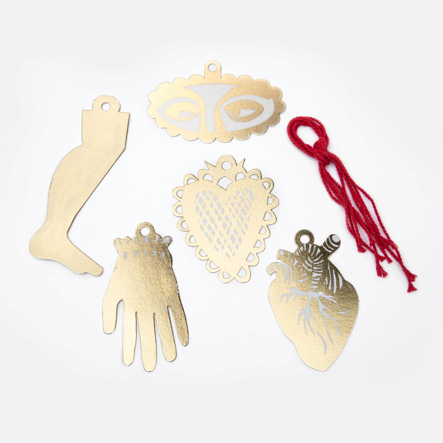 These golden Milagros Charm gift tags are inspired by the use of Milagros in folk custom, which can be traced back to the Iberians.