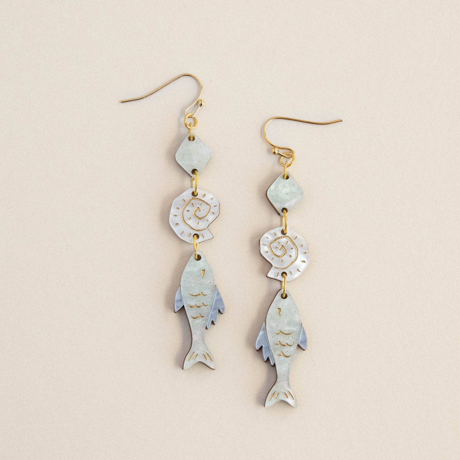 Featuring hand-assembled fish & shell charms made from lightweight acrylic and wood, each piece is delicately etched with gold inked detailing and suspended from gold-plated brass hooks.