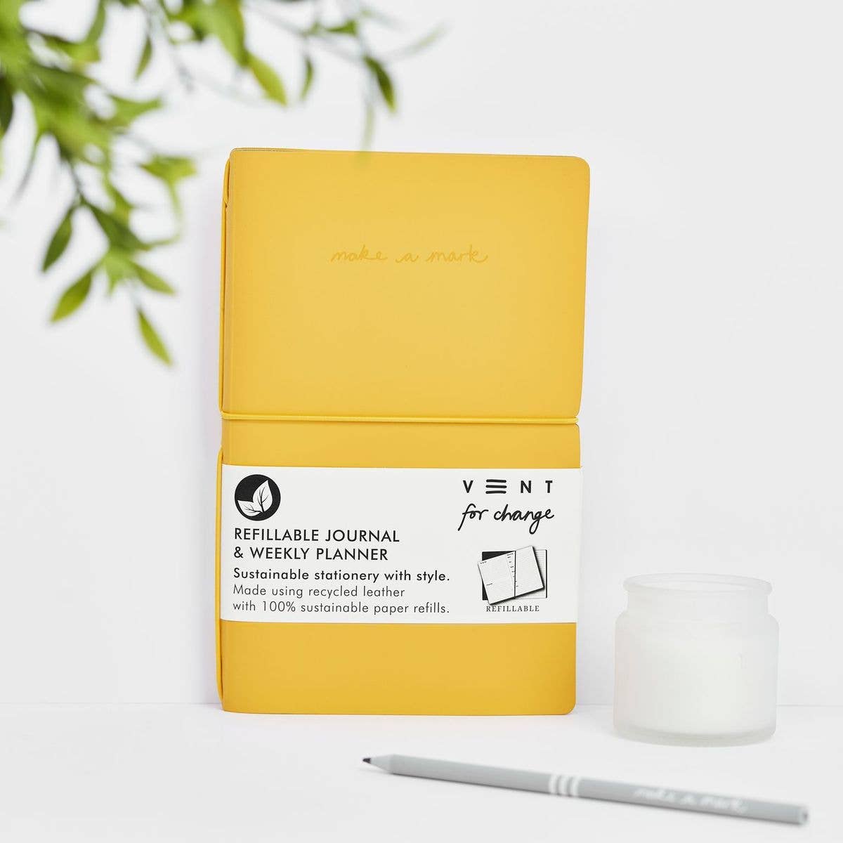 Refillable weekly planner and lined notes made from recycled leather and removable sustainable paper.
