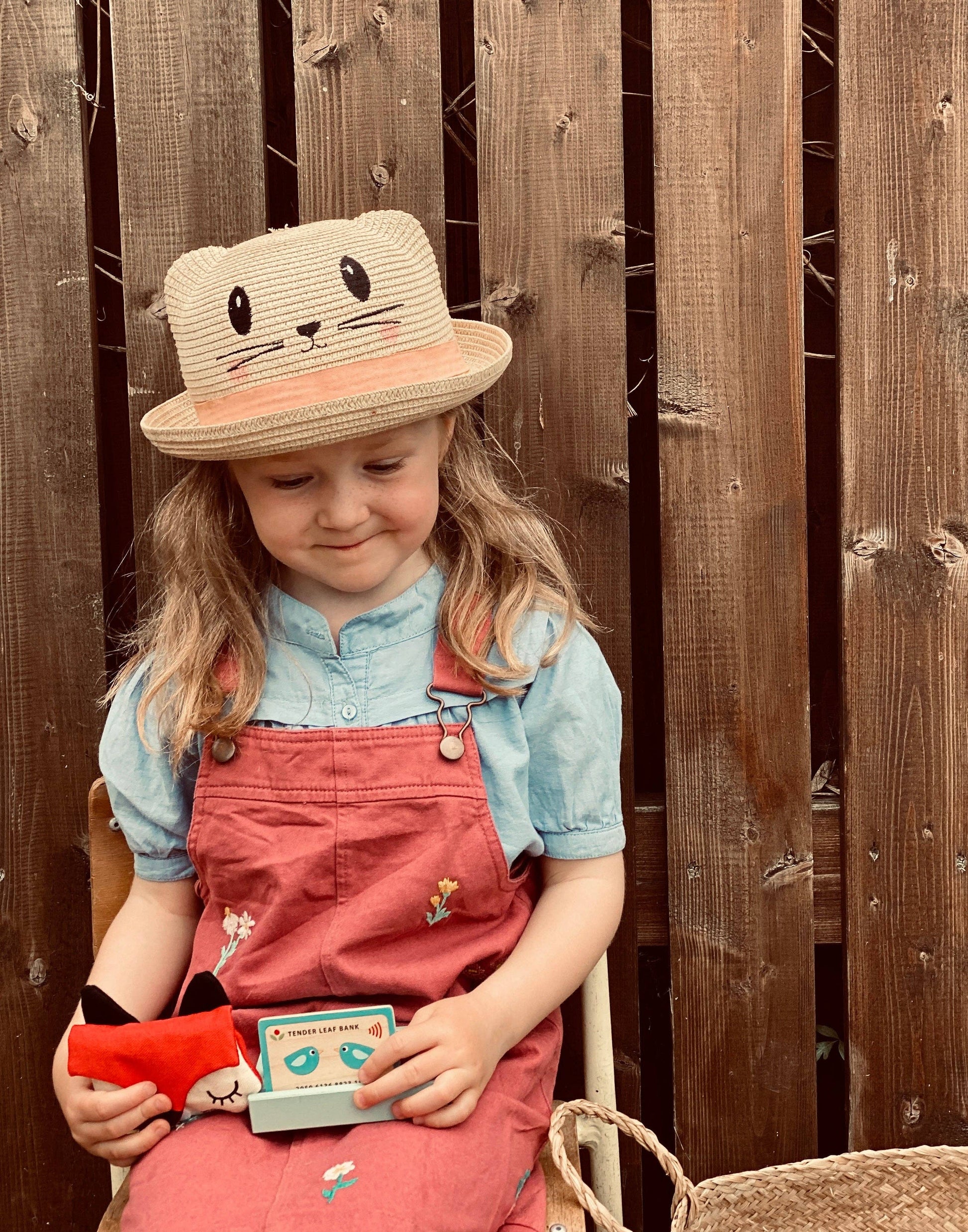 A wooden and fabric money and purse toy for kids. Need to pay for your groceries? Look no further than this cute card reader with squishy number buttons, a slot in which to use your Tender Leaf money card, and a top slot to place one of 5 differently illustrated receipts.