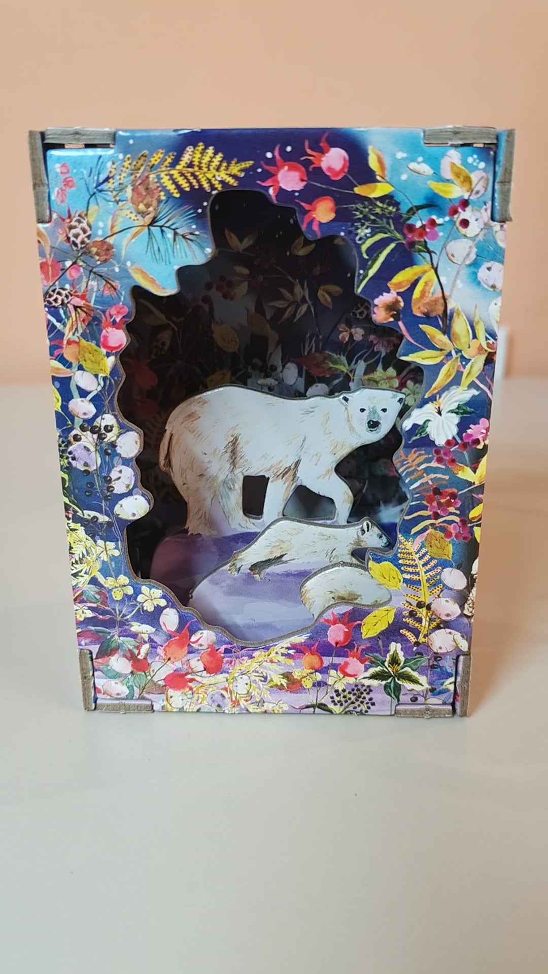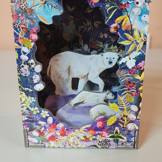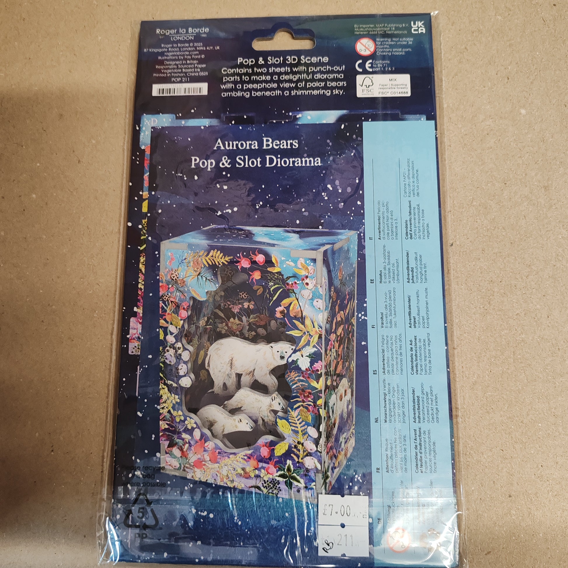 Craft a charming winter scene with the Pop and Slot Aurora Bears Diorama. Made of sturdy cardboard, this reusable diorama captures the tradition of the holiday season. No glue or scissors needed, simply pop and slot the pieces together for a delightful display. Perfect for all ages.