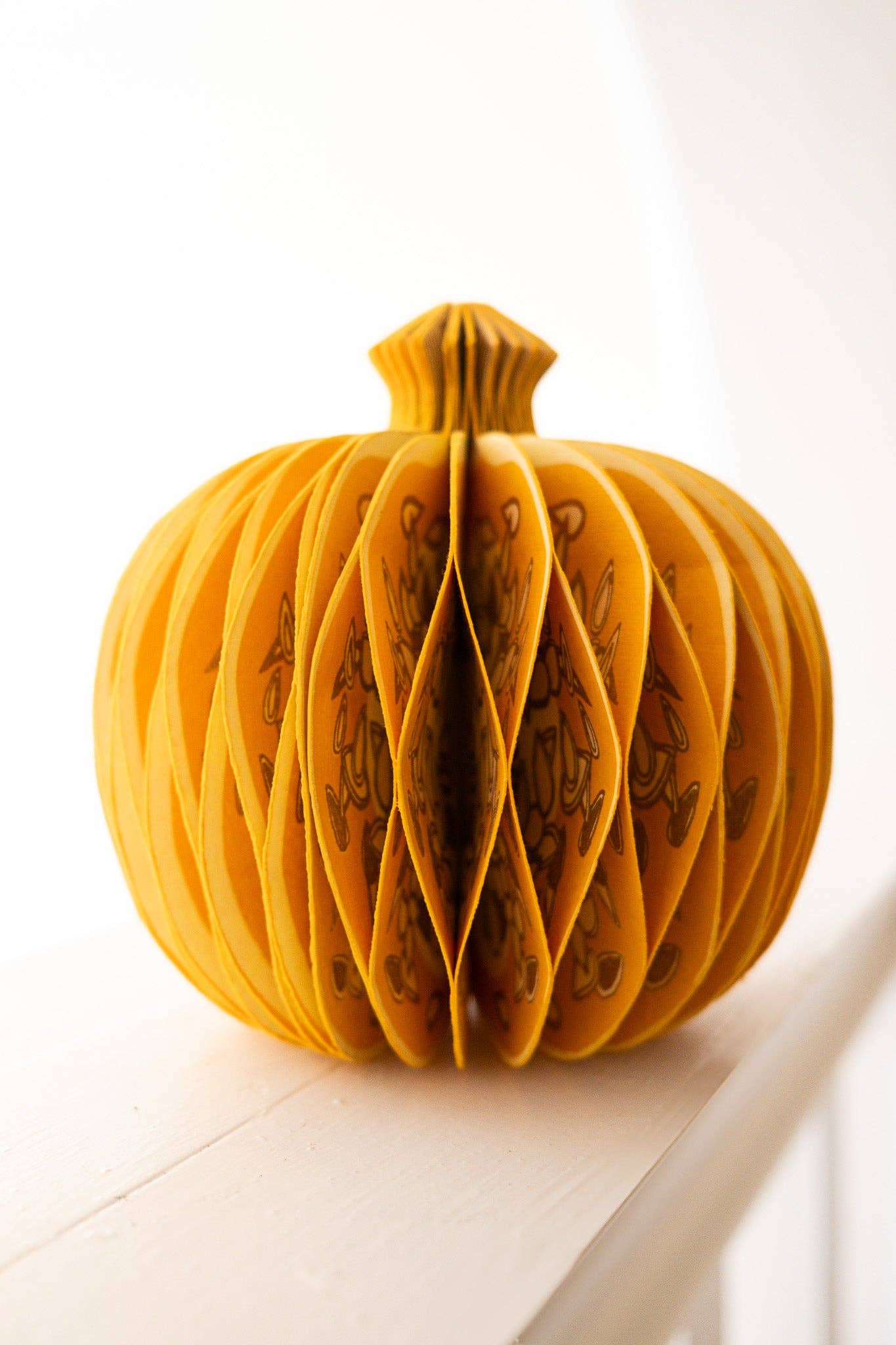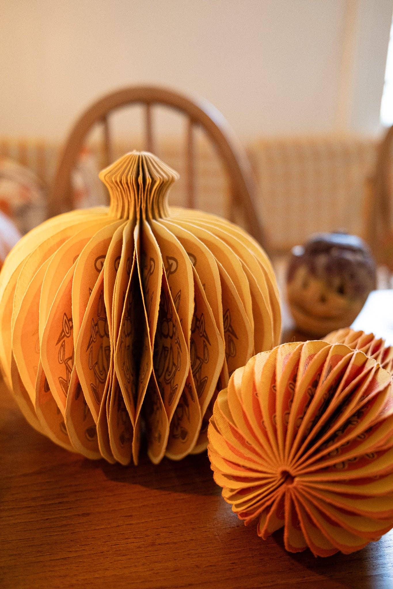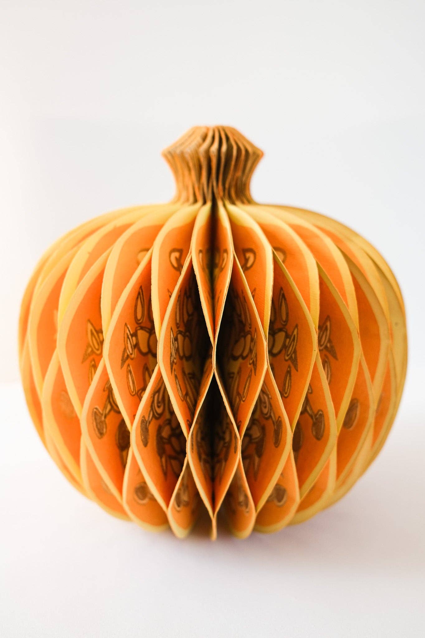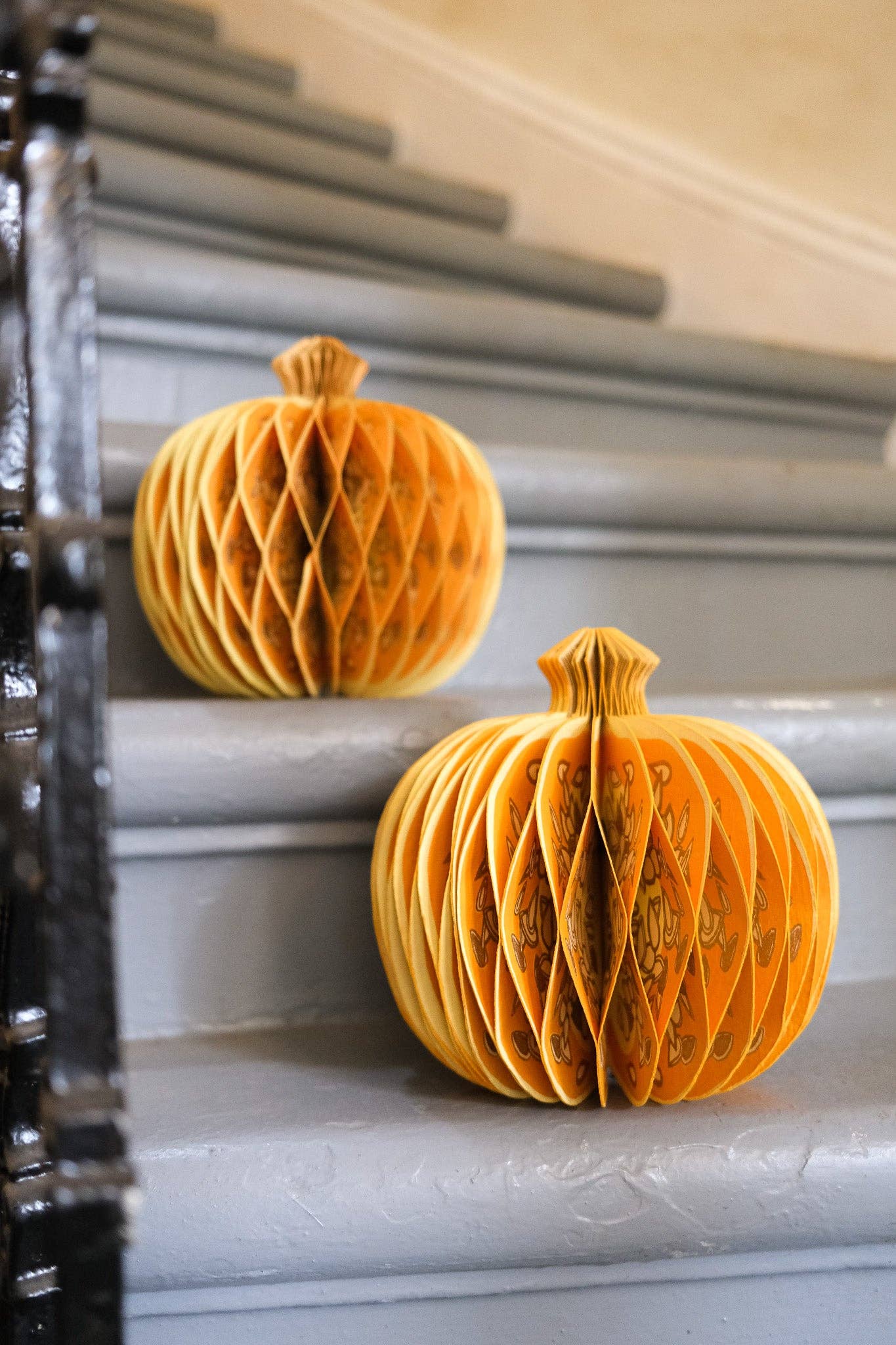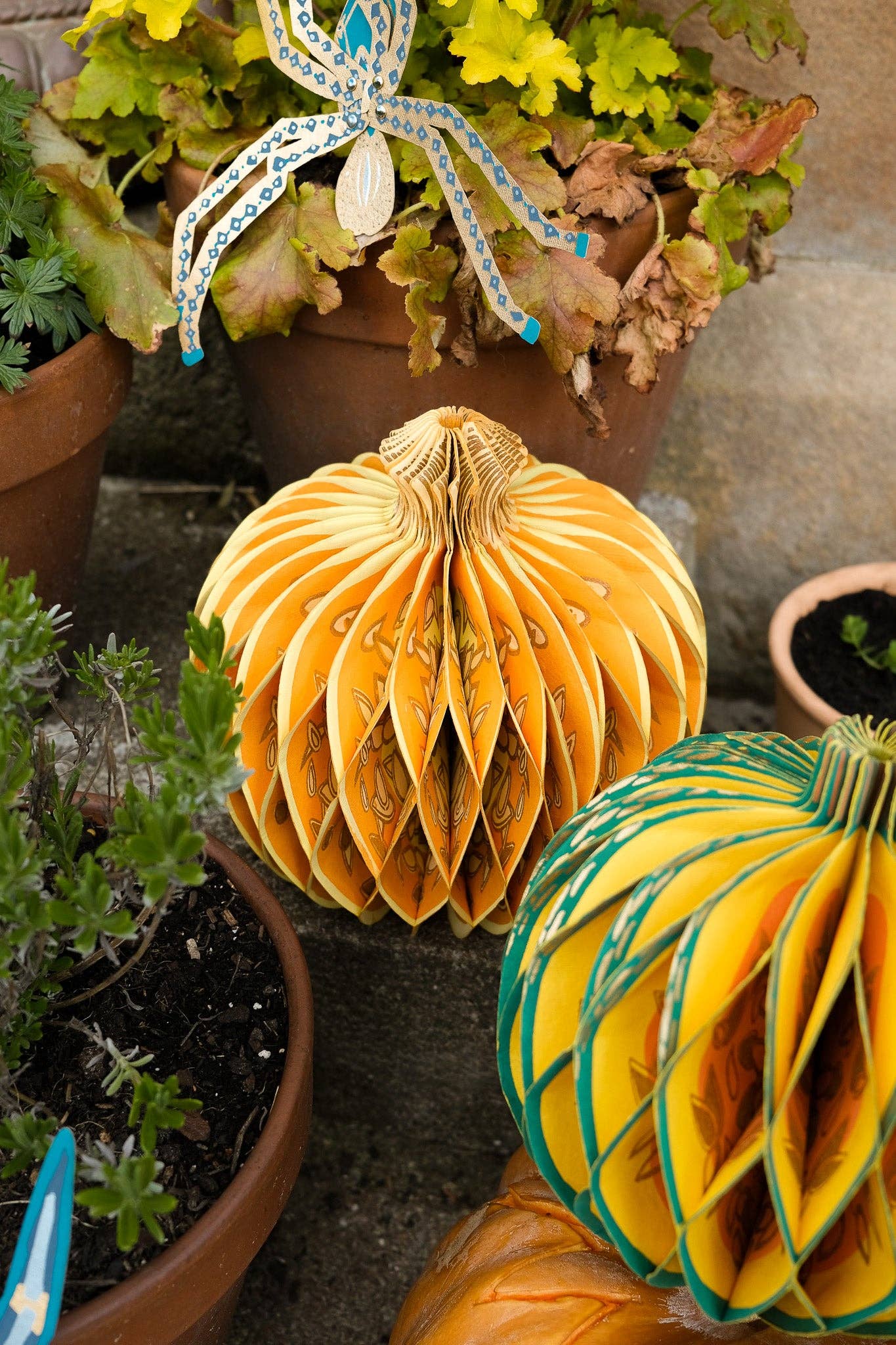 Composed of intricate layers of recycled cotton paper, each decoration unfolds to reveal a three-dimensional pumpkin honeycomb.