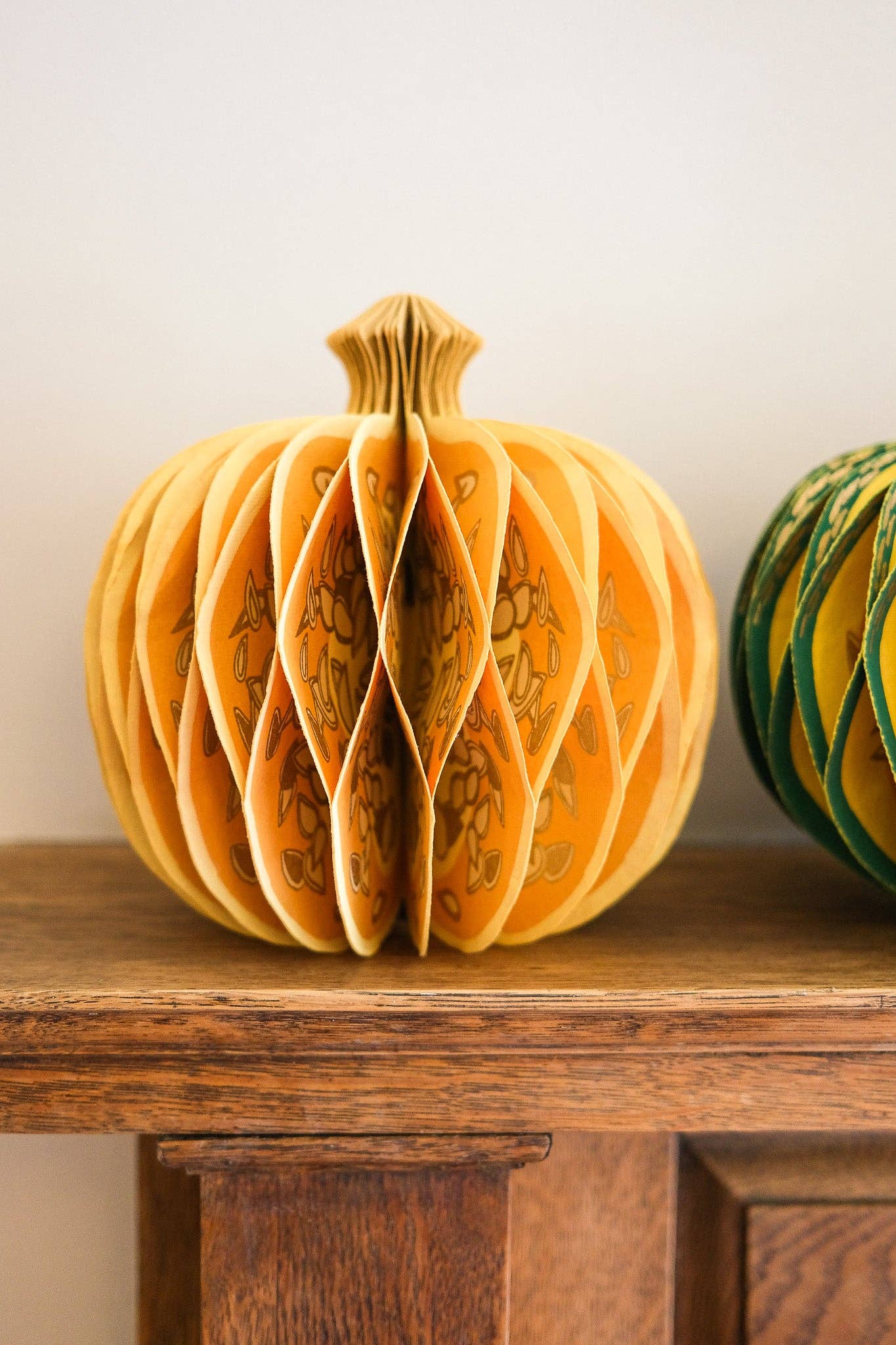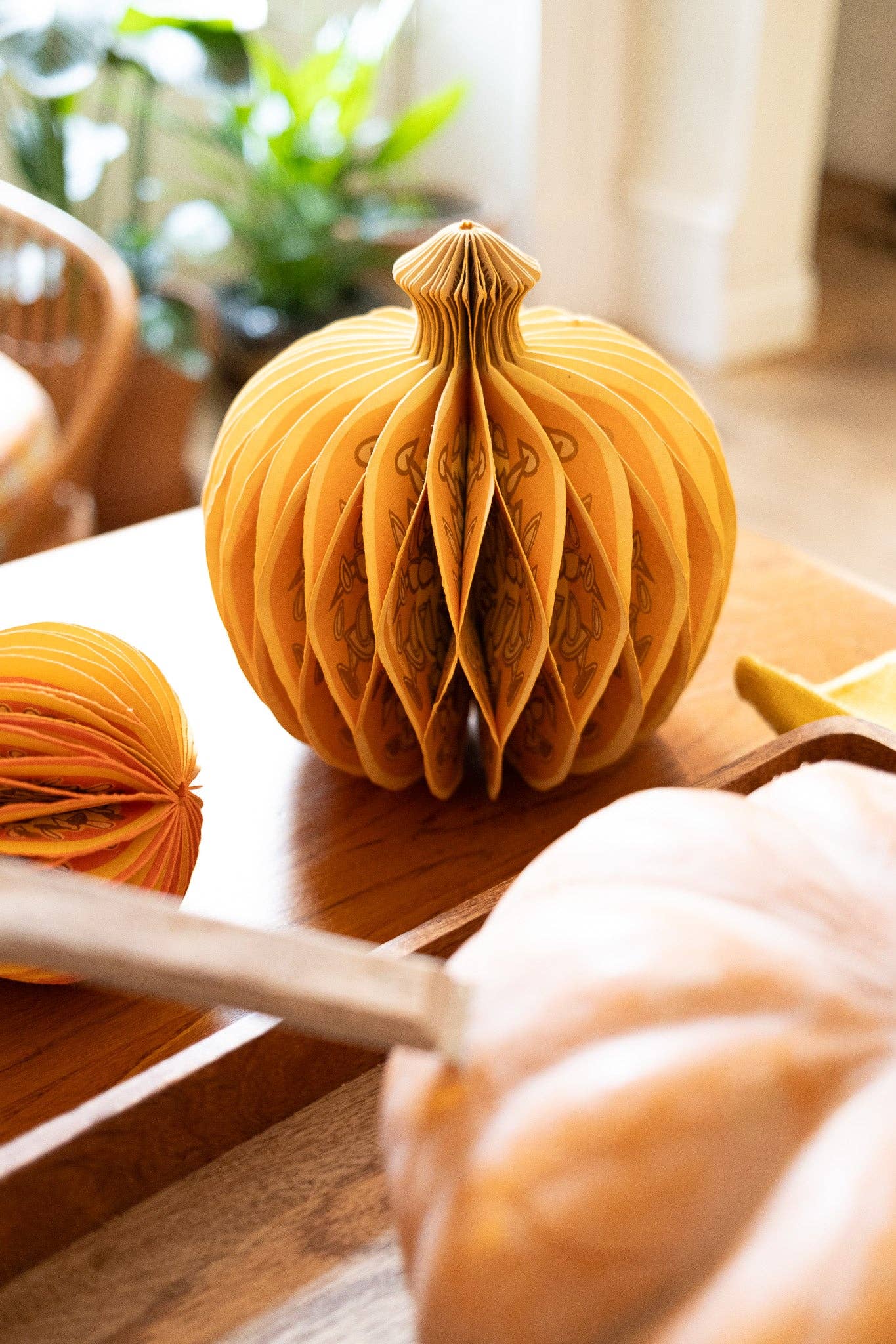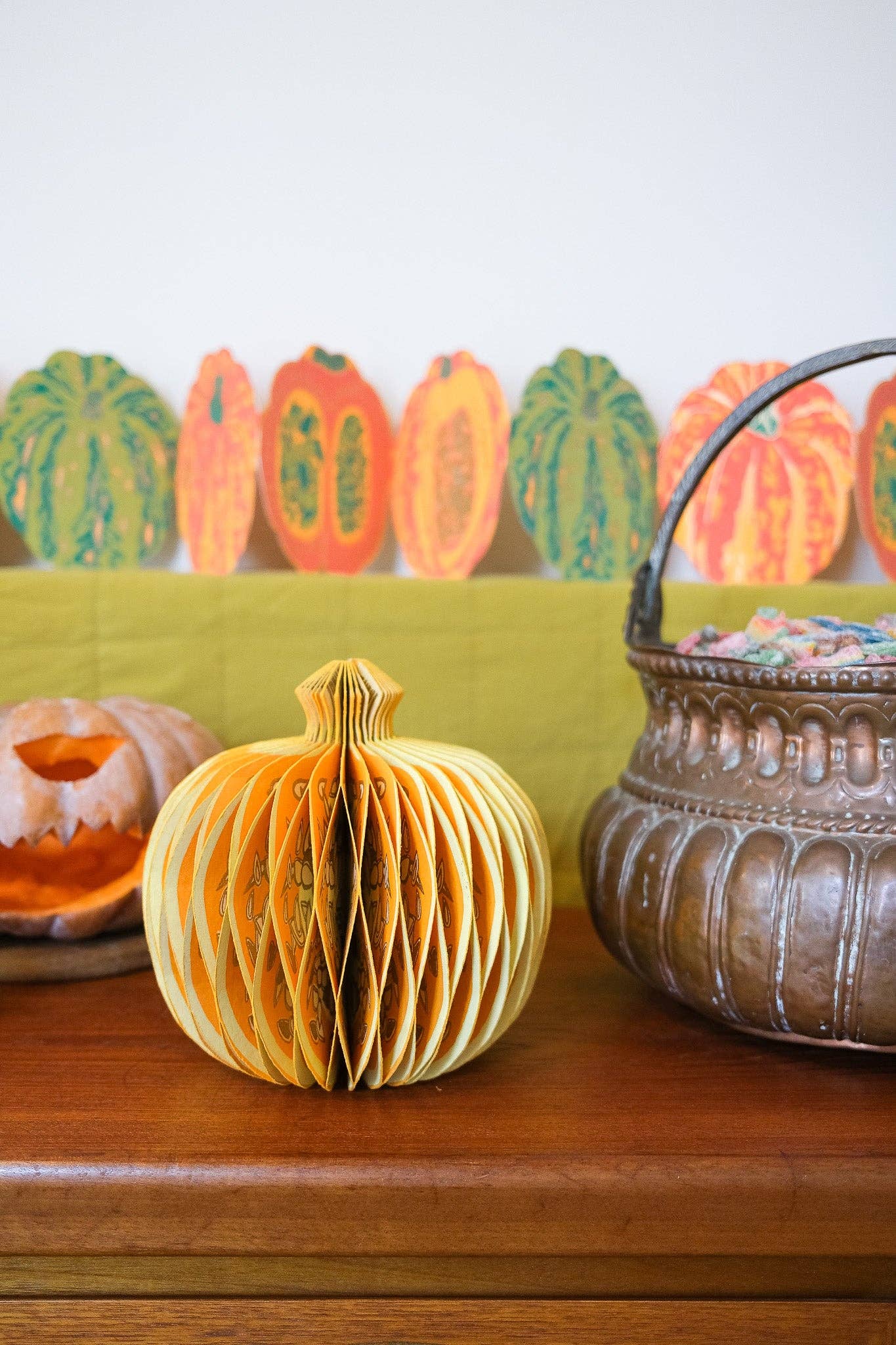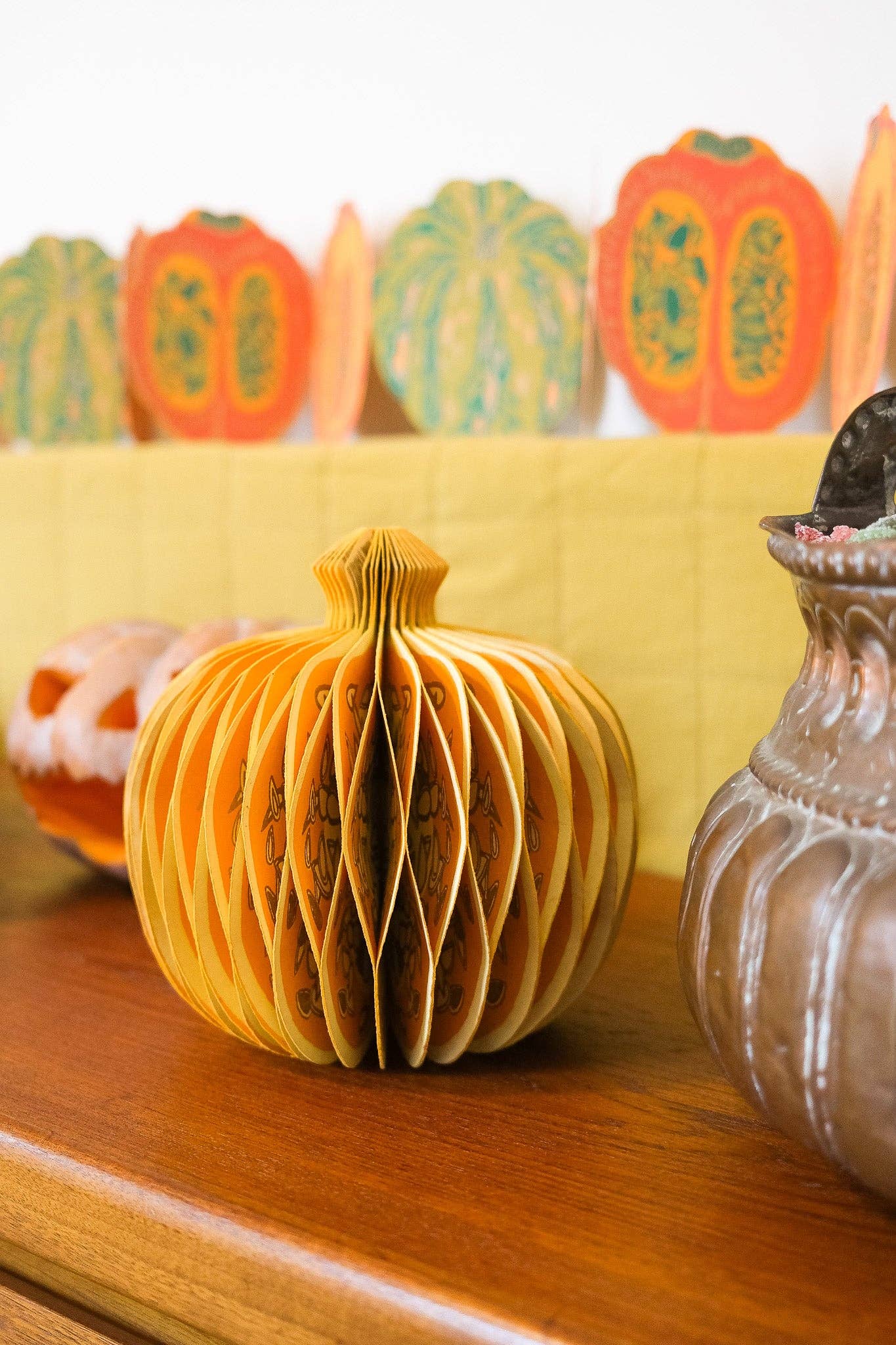Composed of intricate layers of recycled cotton paper, each decoration unfolds to reveal a three-dimensional pumpkin honeycomb.