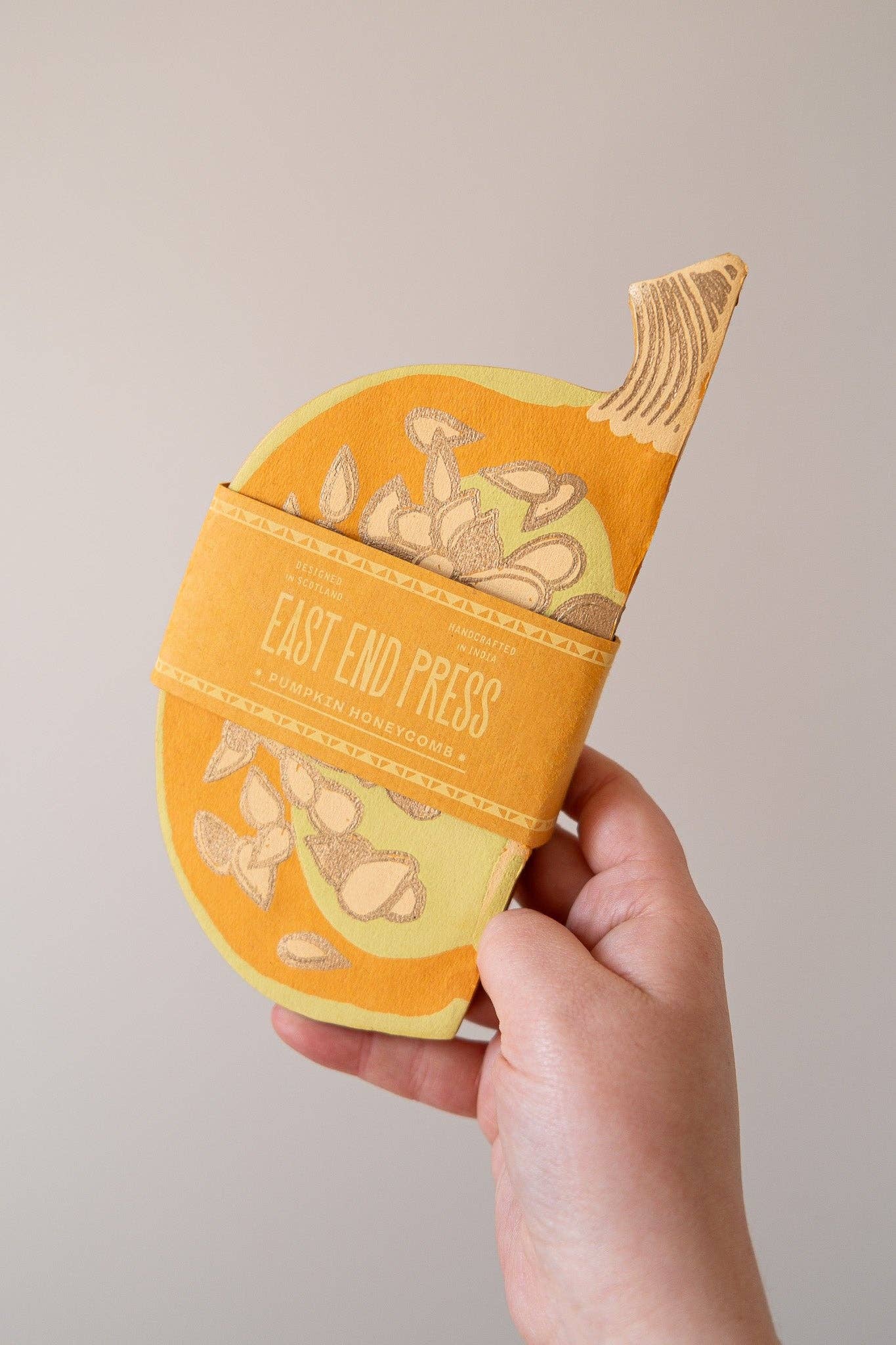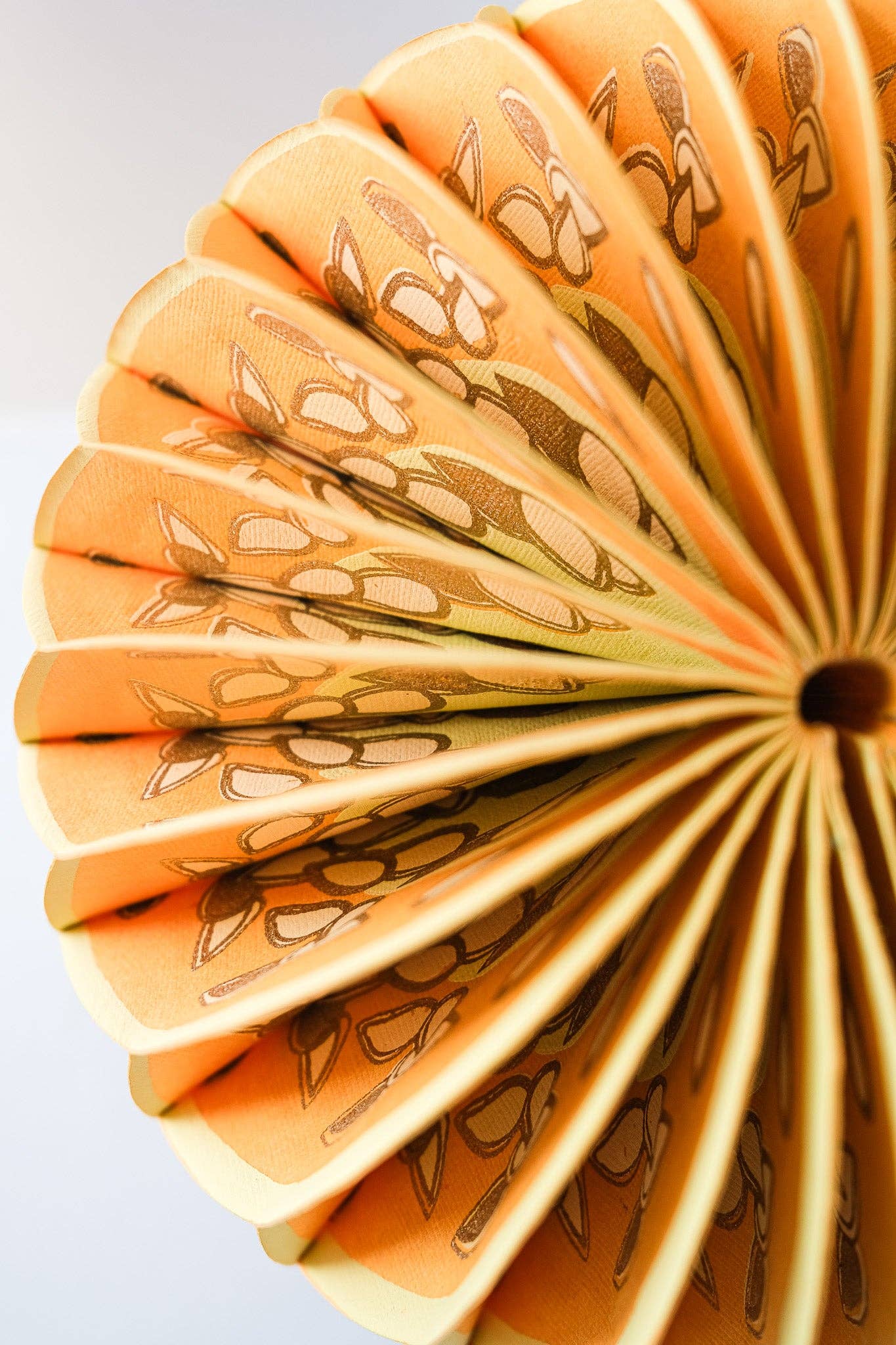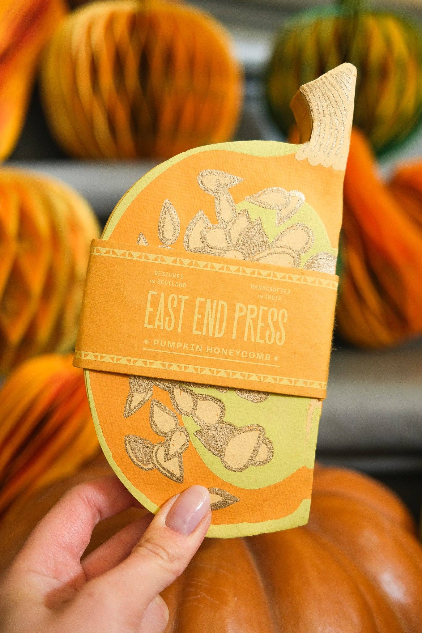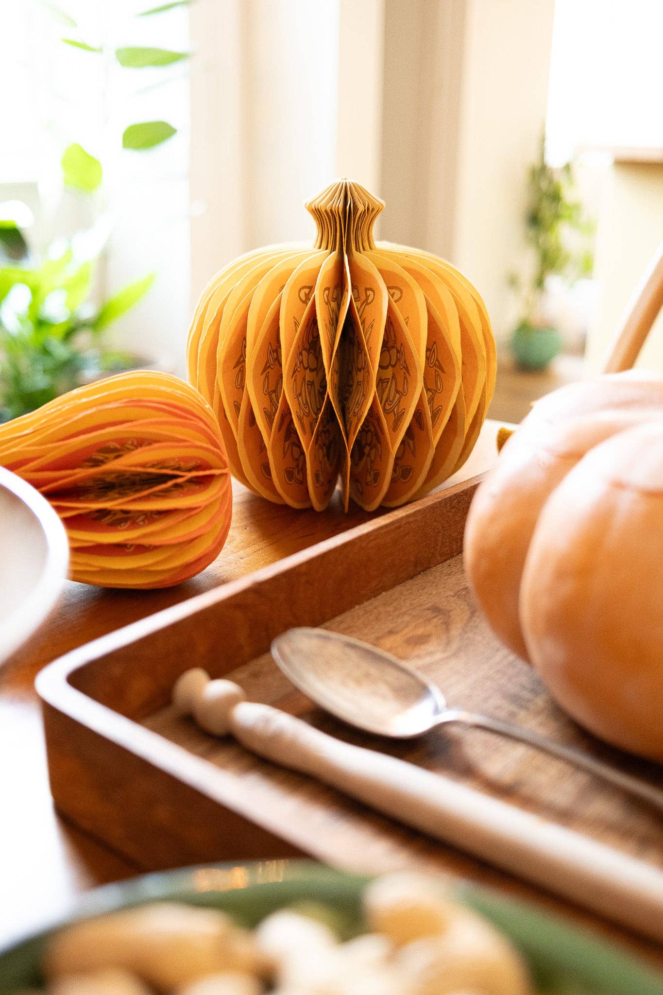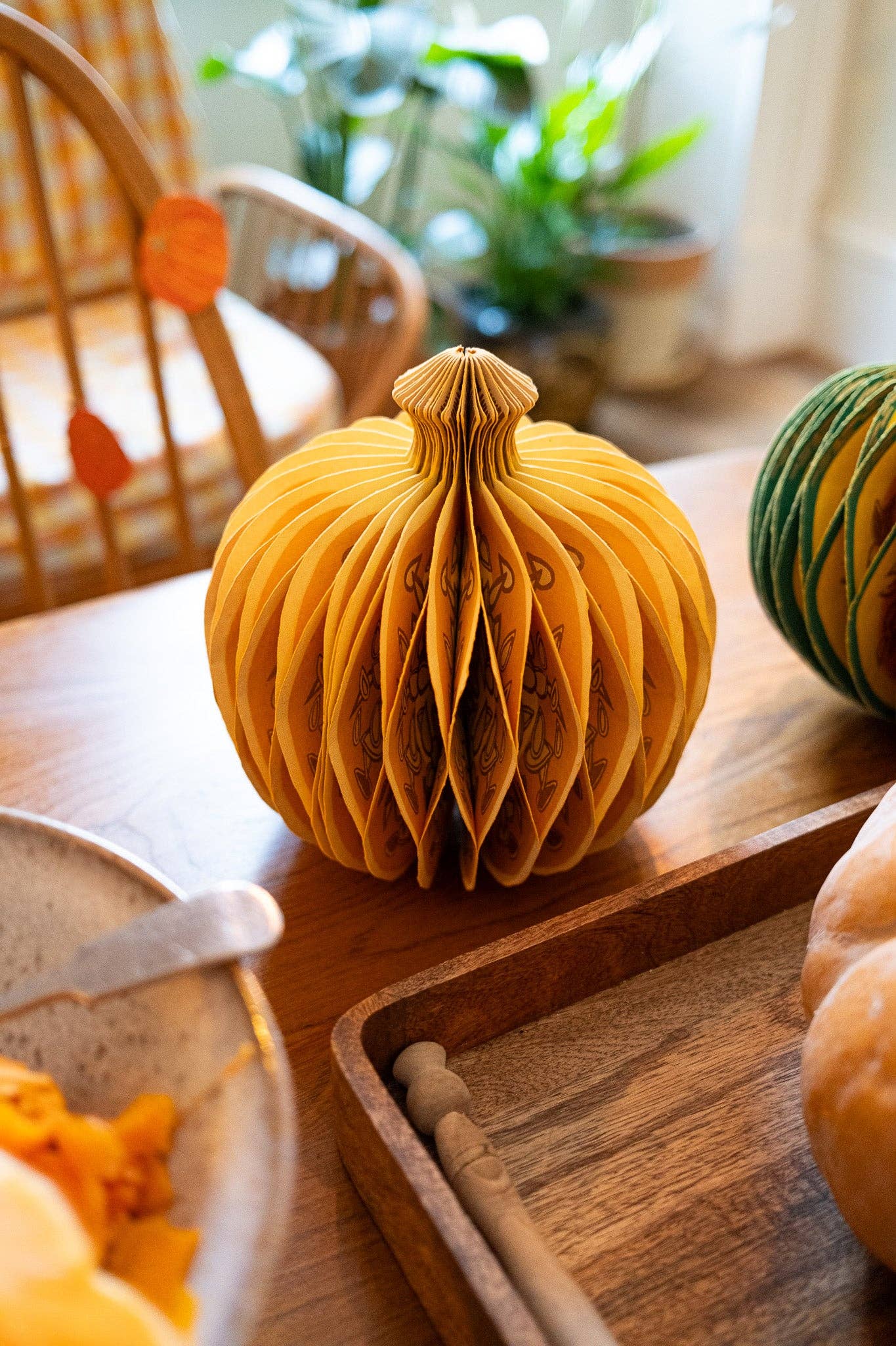 Composed of intricate layers of recycled cotton paper, each decoration unfolds to reveal a three-dimensional pumpkin honeycomb.