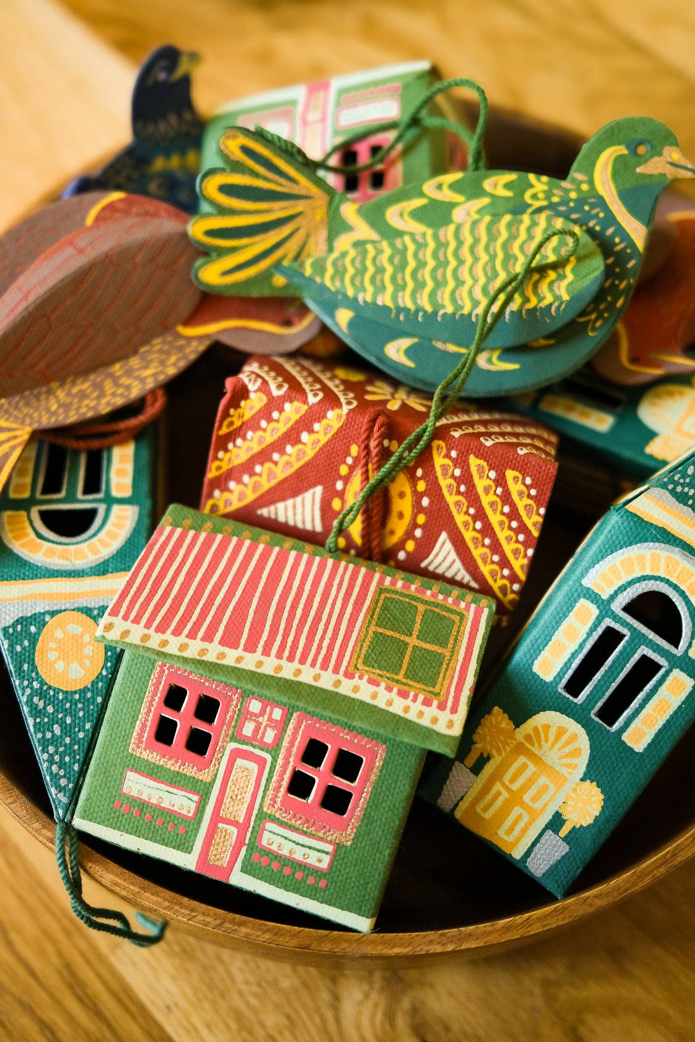 Screen printed board ornament, sustainably made from 100% recycled paper.