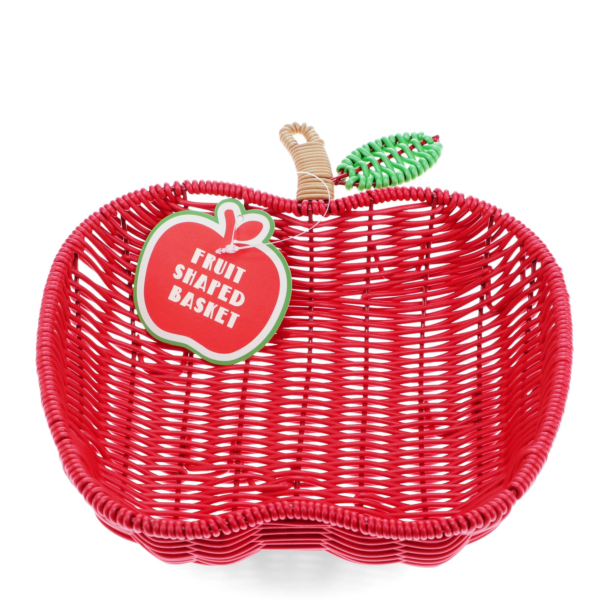 Fun and handy basket, constructed from food-safe plastic, woven around a sturdy metal frame. Featuring a fruity and summery apple design, with vibrant red and green colours and details, it provides a playful and stylish way of storing fruits, snacks, or other household items. Perfect for placing on a shelf, kitchen worktop, or at the centre of a dining table.