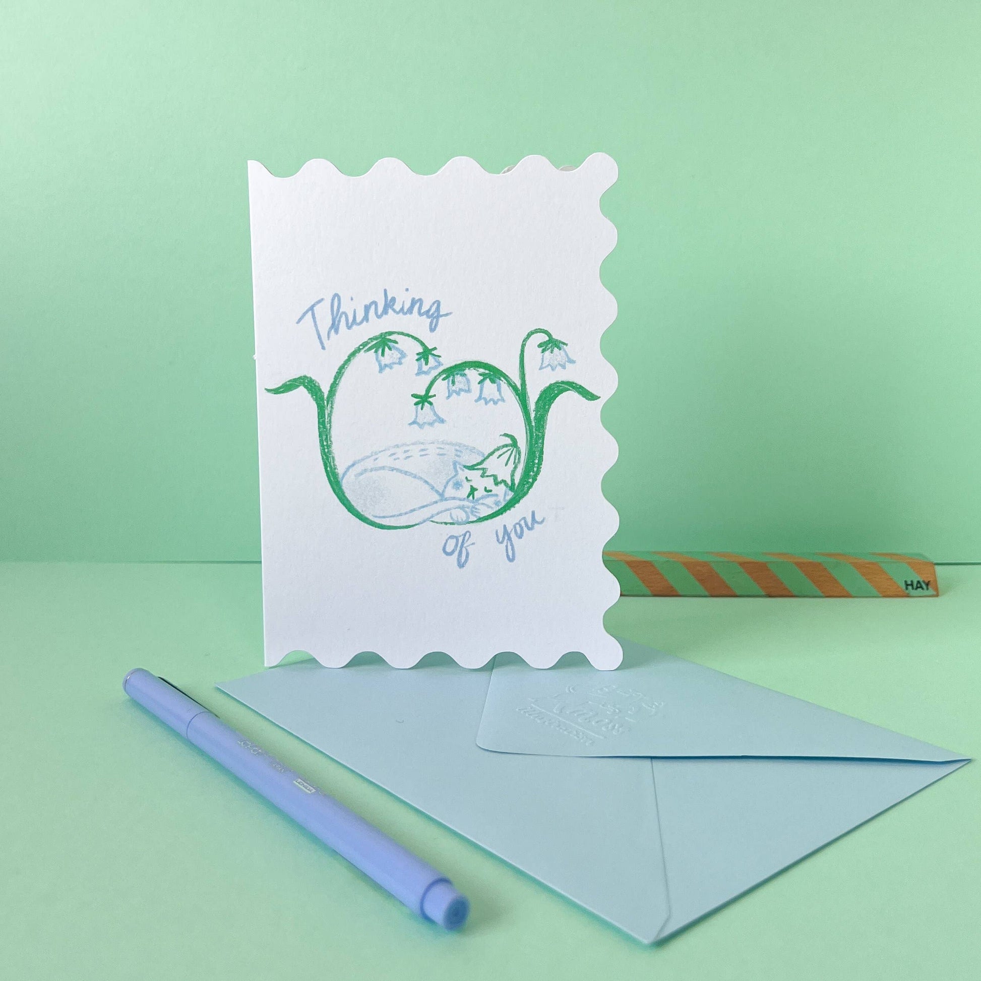 Thinking of You, is a fun and cute scalloped card featuring hand drawn illustrations.