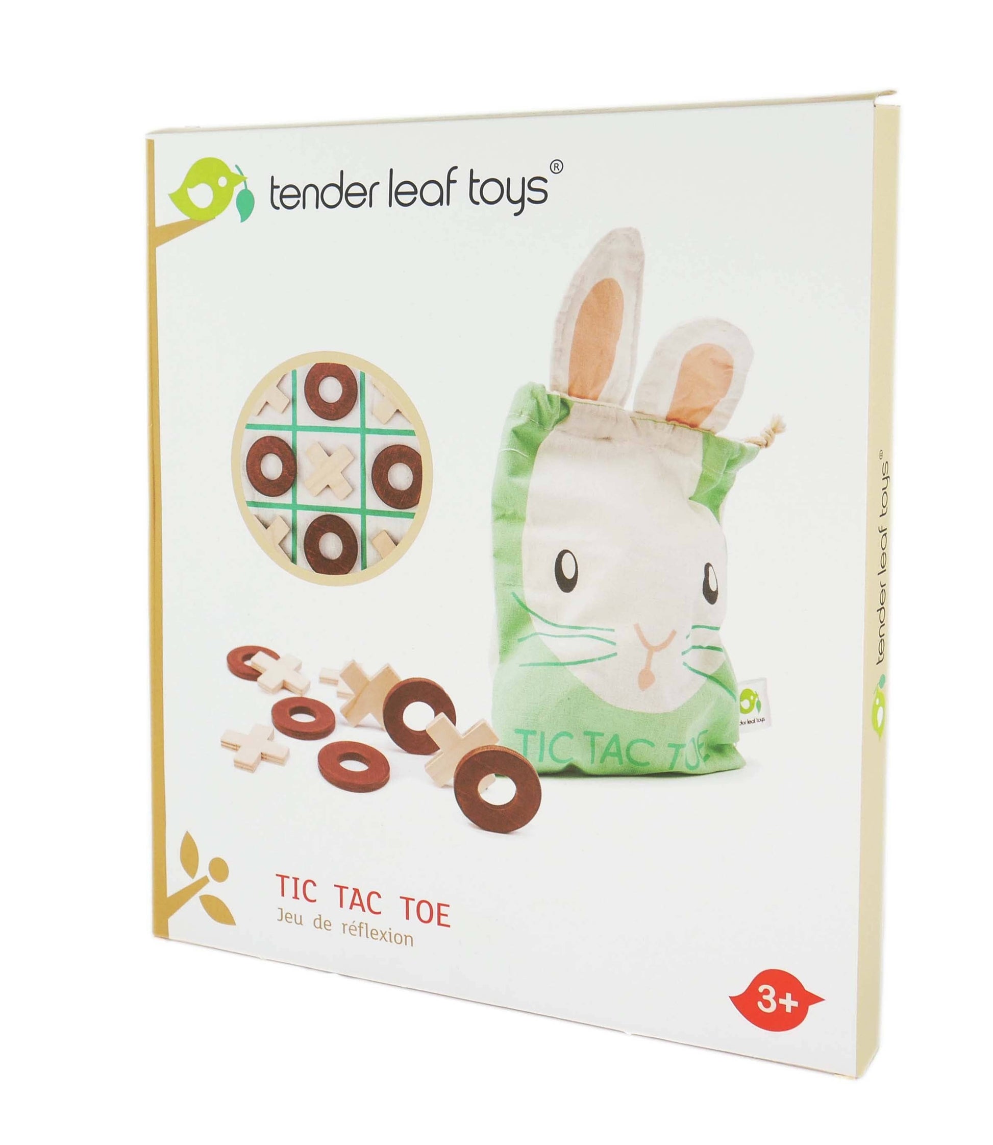 Tic Tac Toe by Tender Leaf Toys 5 wooden crosses and 5 wooden circles with a bunny drawstring bag made for children, turn the bag over to play Tic tac toe, or Noughts and Crosses depending on where you live! Made from sustainable rubberwood, coloured with a soft non-toxic waterstain for a contemporary style. Presented in an illustrated colour box Age range: 3 years and older Product size: Bag: L: 16.50 x W: 30.50 x H: 0.60 cms