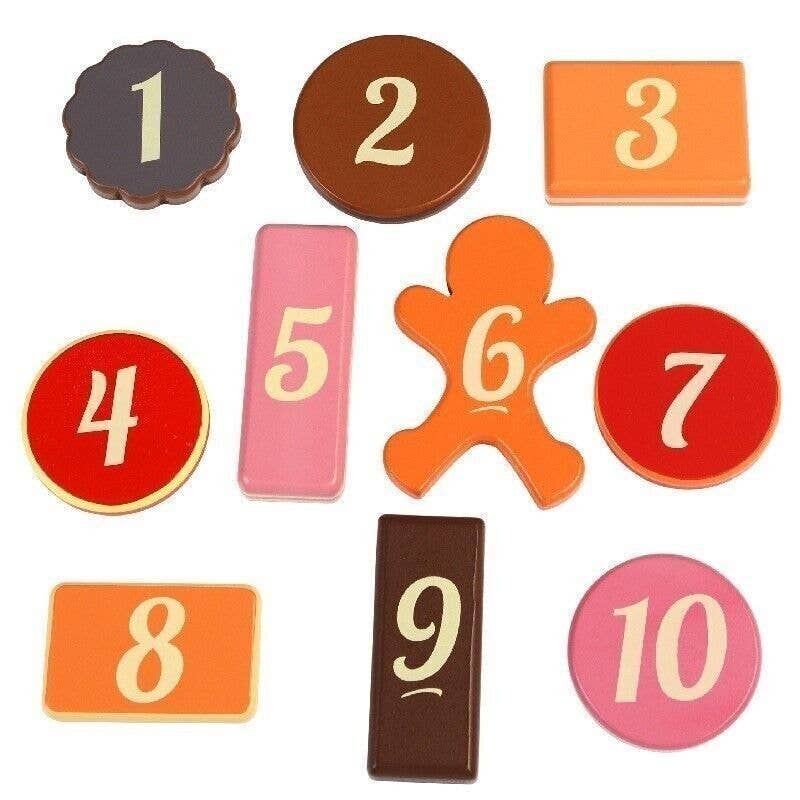 This traditional toy contains an assortment of 10 traditional wooden biscuits in a retro-style wooden box. Each biscuit is also numbered on the reverse, for fun learning through play.Biscuits range from 5cm diameter for the circular to 8cm x 6cm for the gingerbread man.