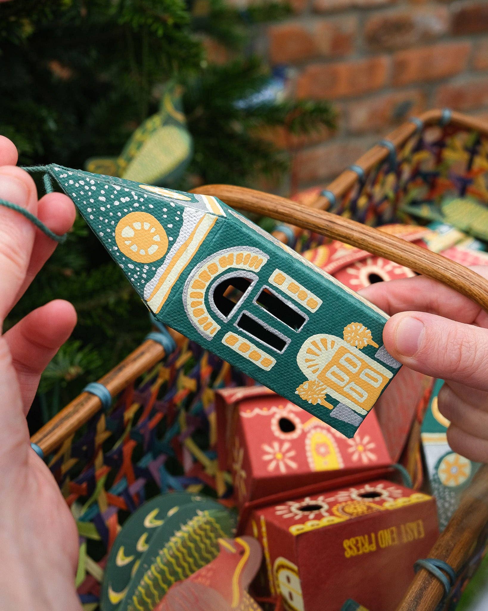 Screen printed board ornament, sustainably made from 100% recycled paper.