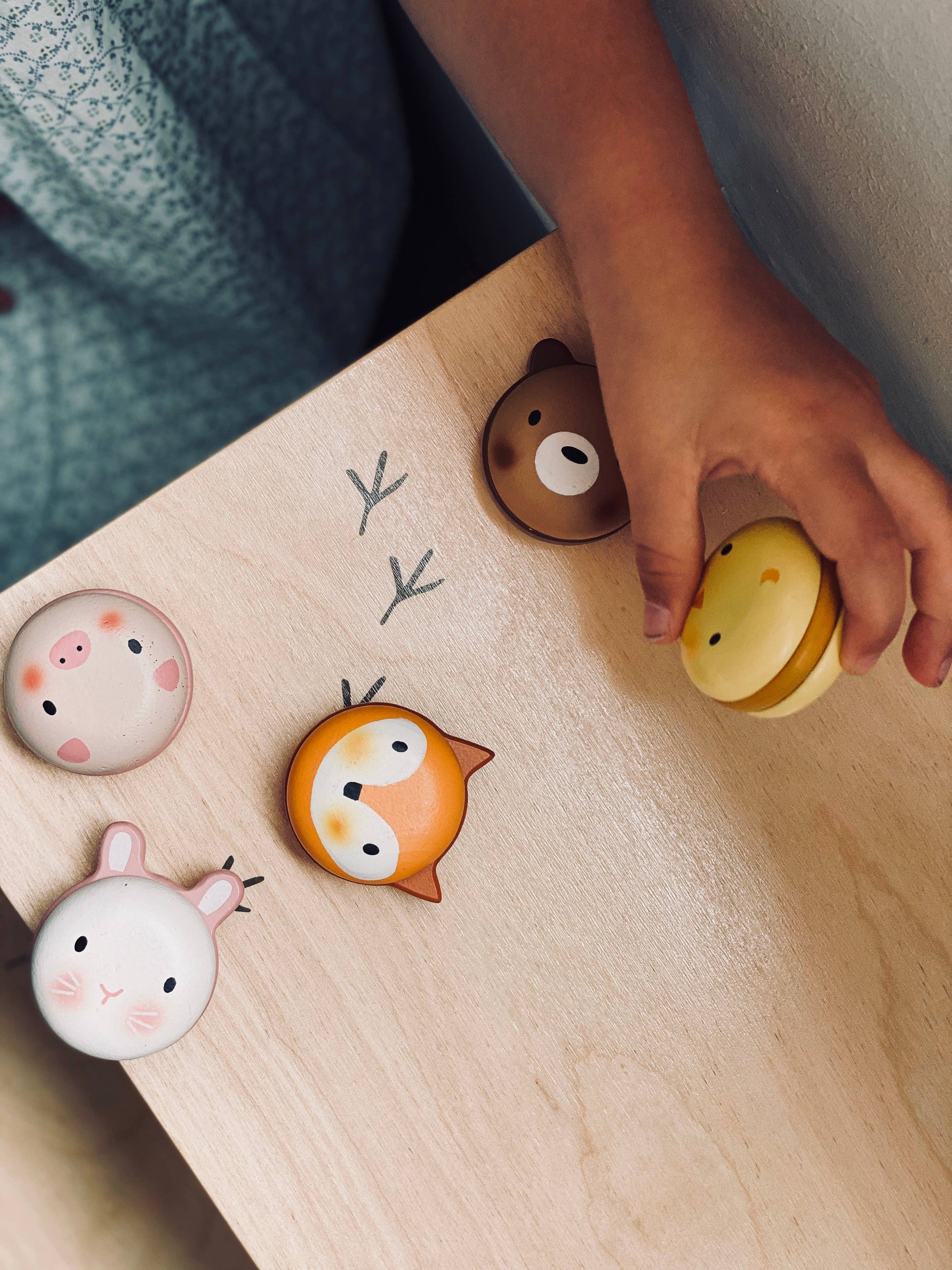 Wooden roleplay tea set macaroon toy for kids by Tender Leaf Toys 5 beautifully coloured macarons to resemble a chick, bunny, bear, piglet, and fox. Each macaron has a separately coloured filling just like the real thing! Crafted from sustainable rubber wood painted in pretty non toxic contemporary colours. Presented in a pretty illustrated window box. Age range: 24 months+ Product size: 25 x 5.5 x 3 cms Animal magic Our little animals from the Tender Leaf macarons toy need some bodies adding!
