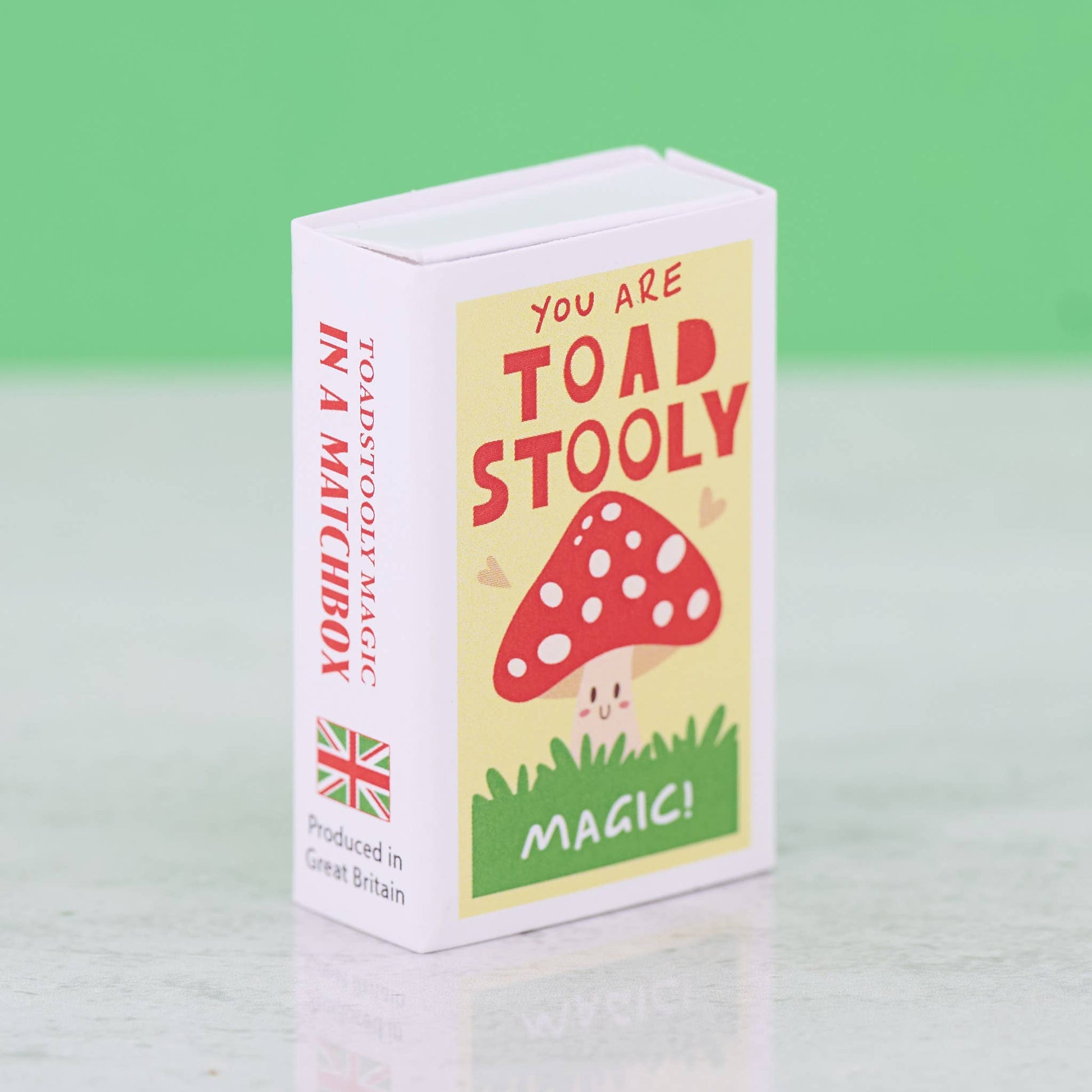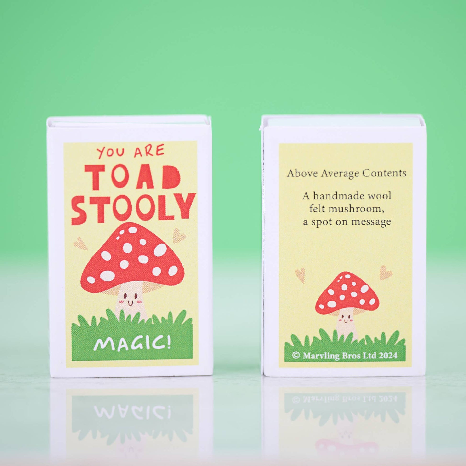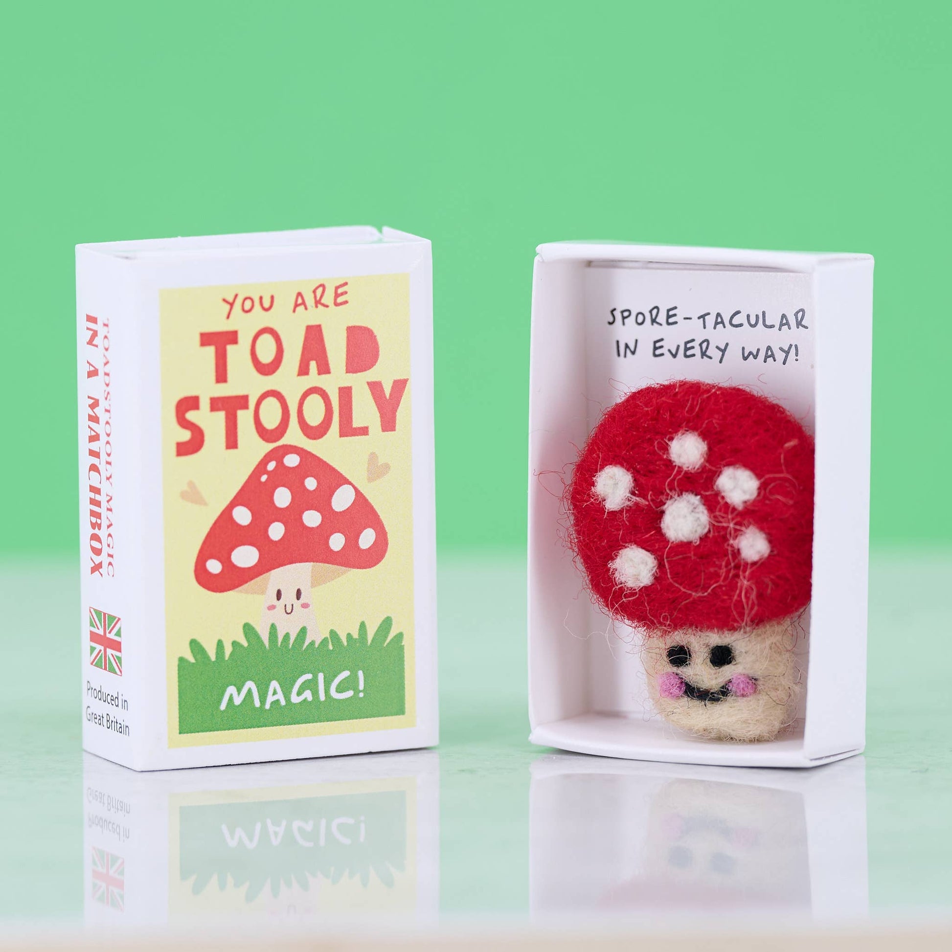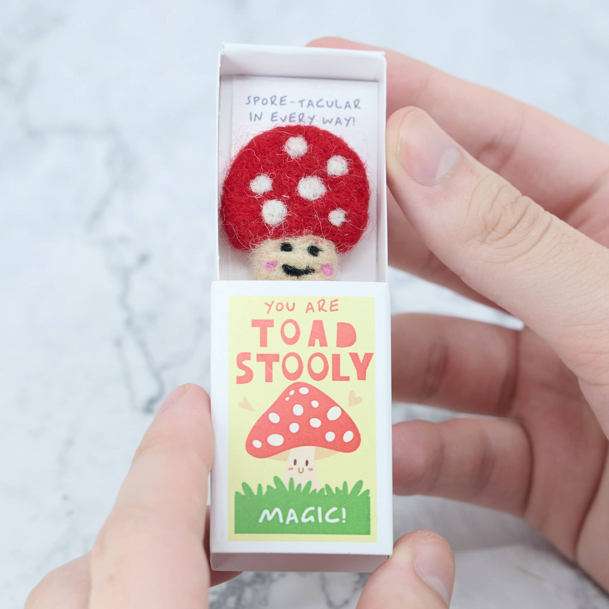 The front of the matchbox features the message 'You are toadstooly magic'. Inside, your special someone will find a handmade wool felt toadstool along with the humorous words "You are Spore-tacular!"